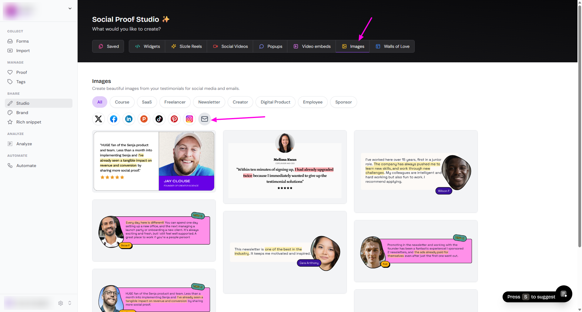Note: You cannot embed Senja's testimonial widgets into emails. Instead, create testimonial images in Senja Studio and upload them to your email marketing platform.