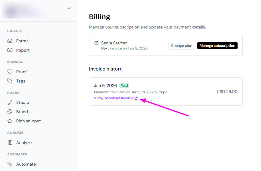 You can view and download your past invoices from your Senja dashboard.