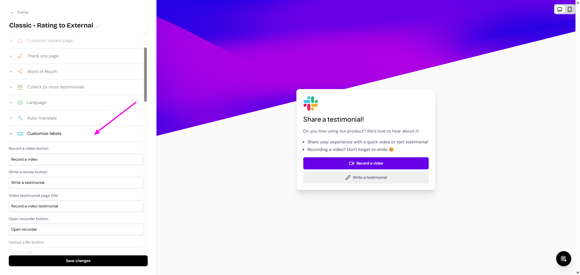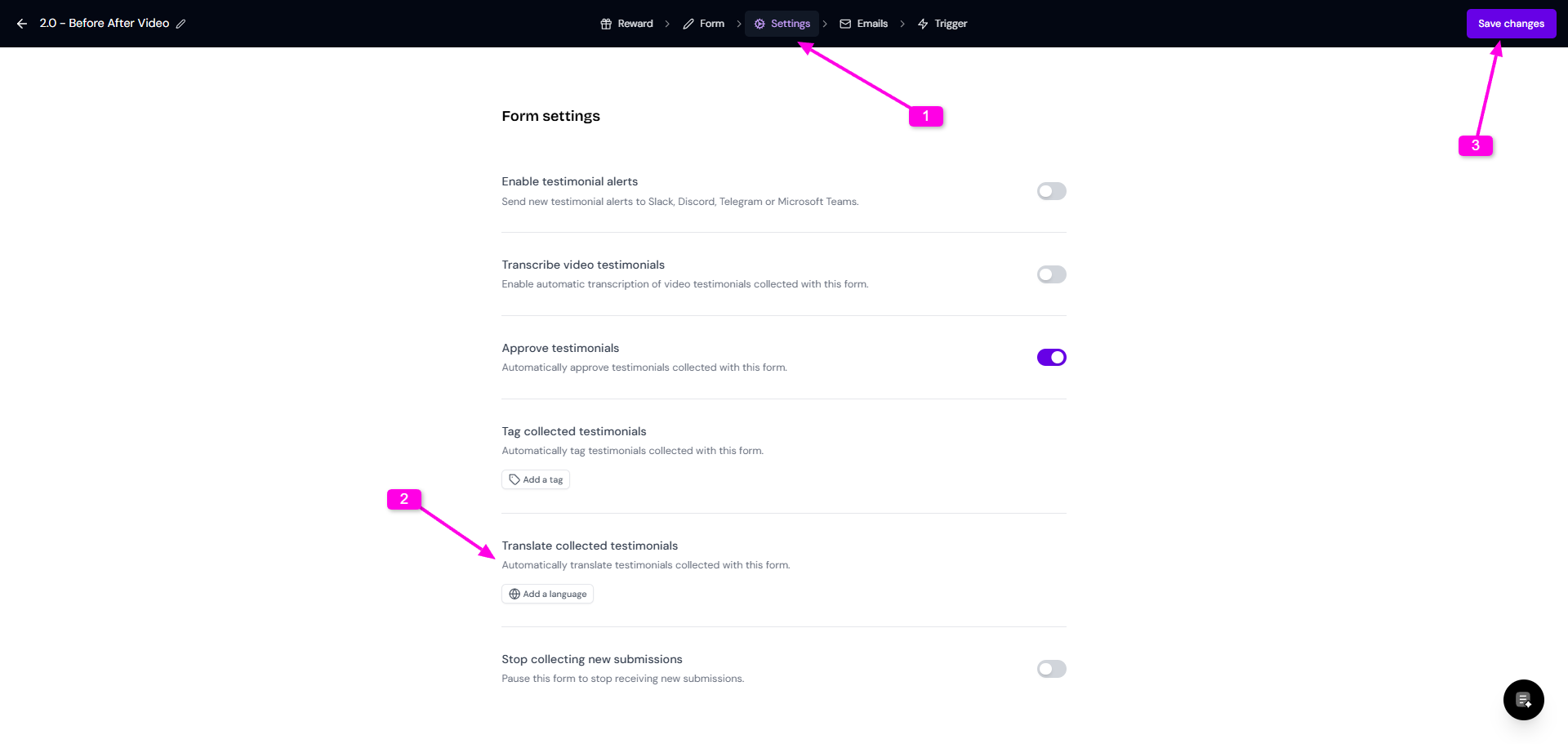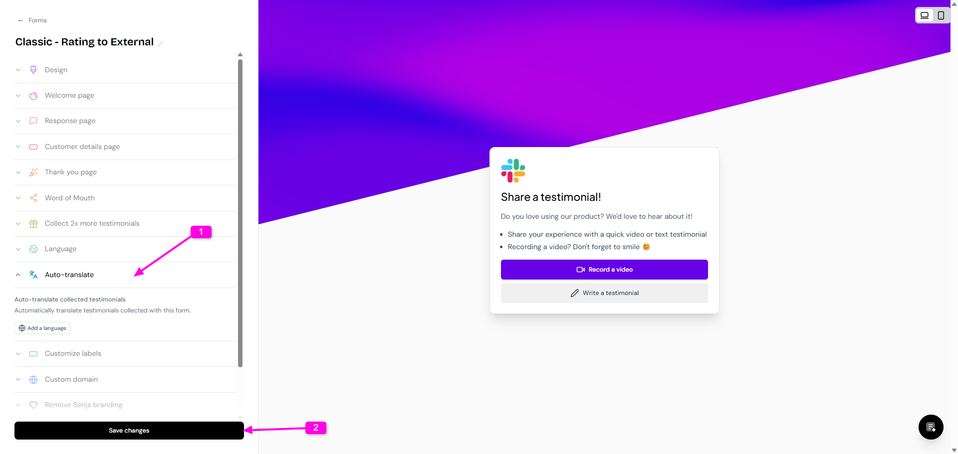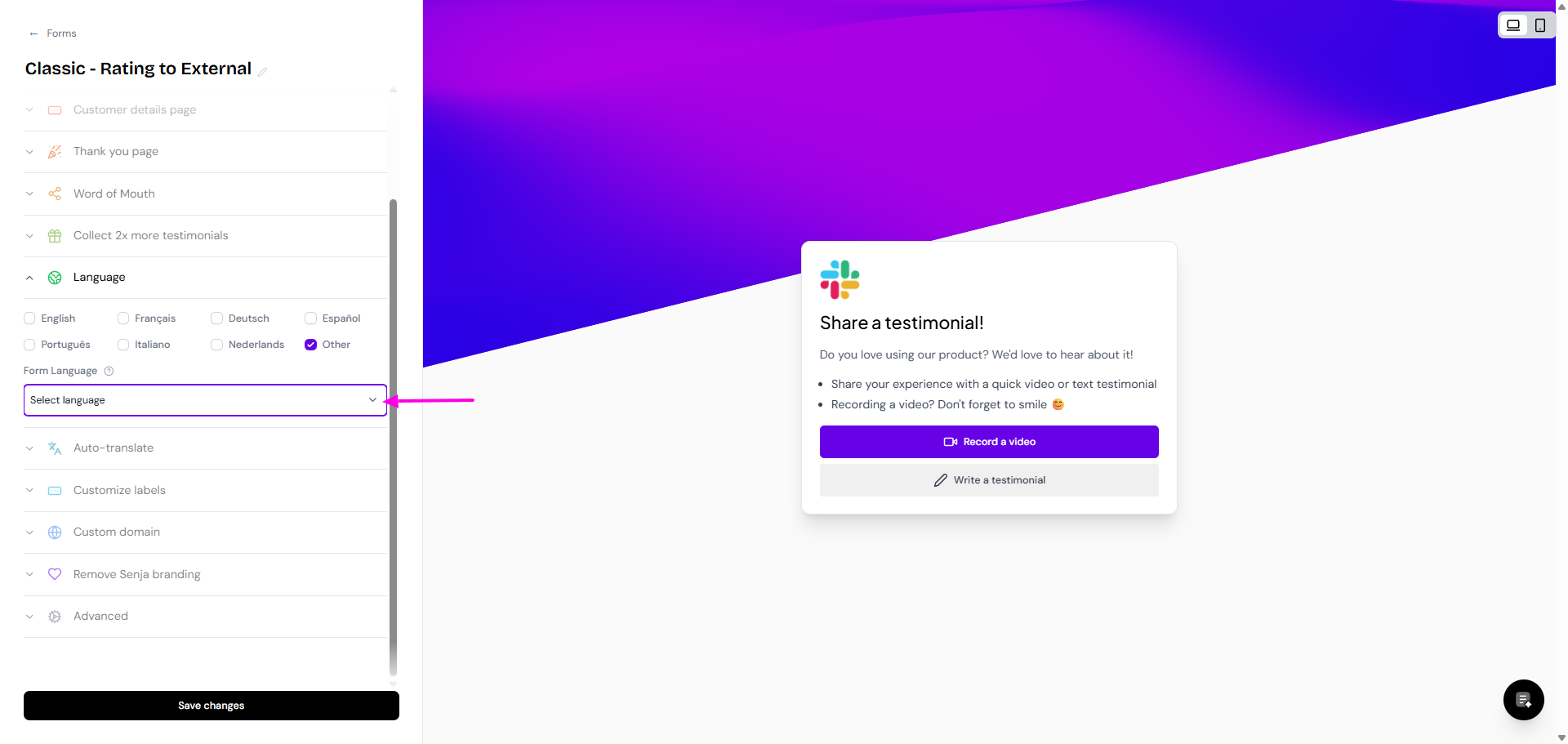 Senja supports 18 languages for your testimonial forms, with new languages added monthly. You can customize form labels or set up automatic translation of submissions.