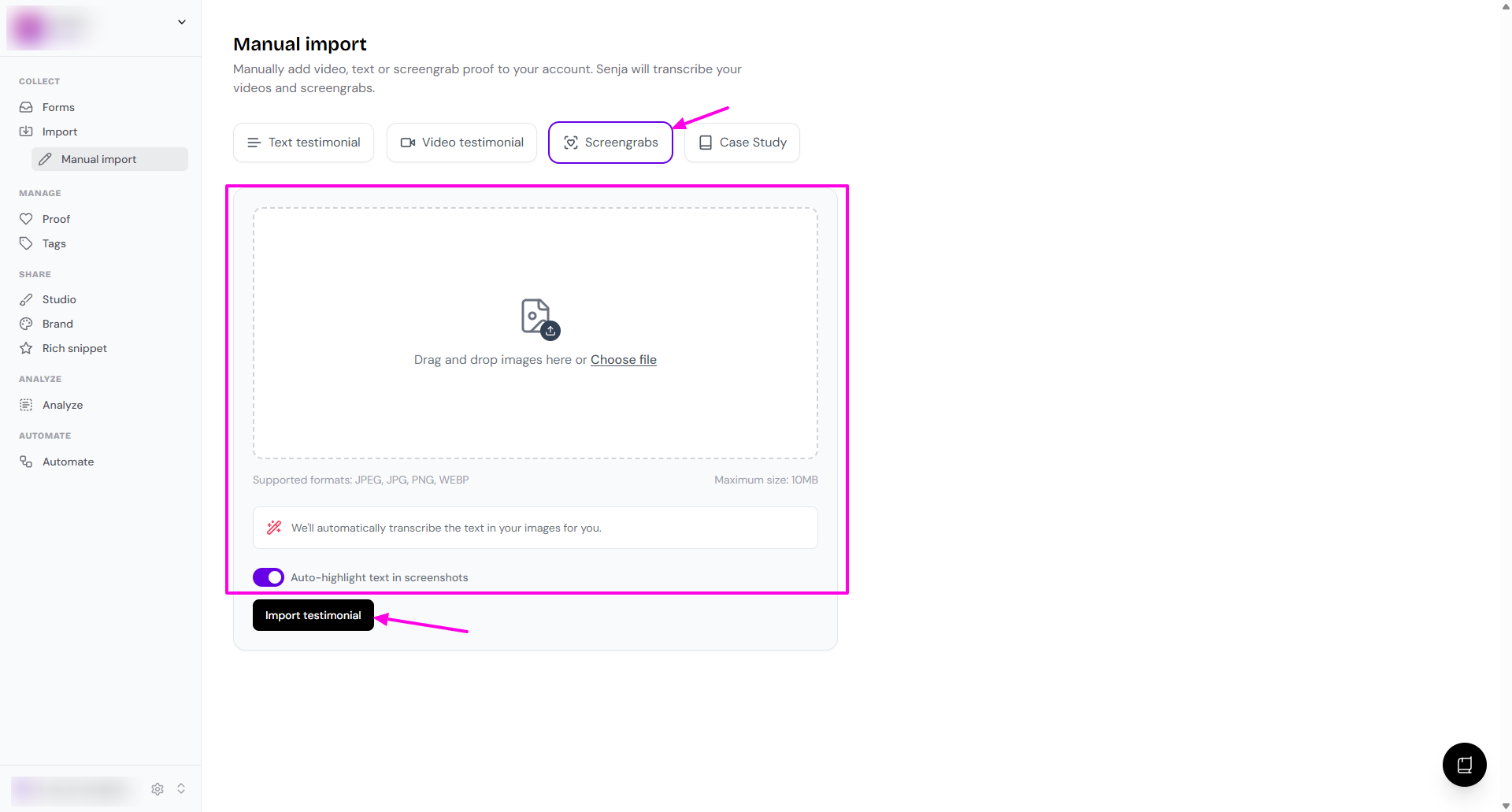 Now, you can import images, like screengrabs of your customer love, into Senja. We'll automatically transcribe them for you, so you can always find the perfect testimonial at the right time!