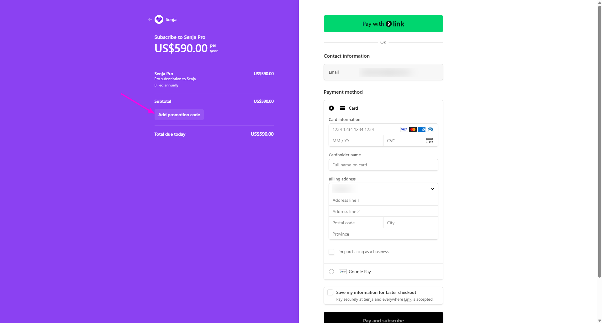 The promo code field isn't visible by default. Click Add promotion code to reveal it
