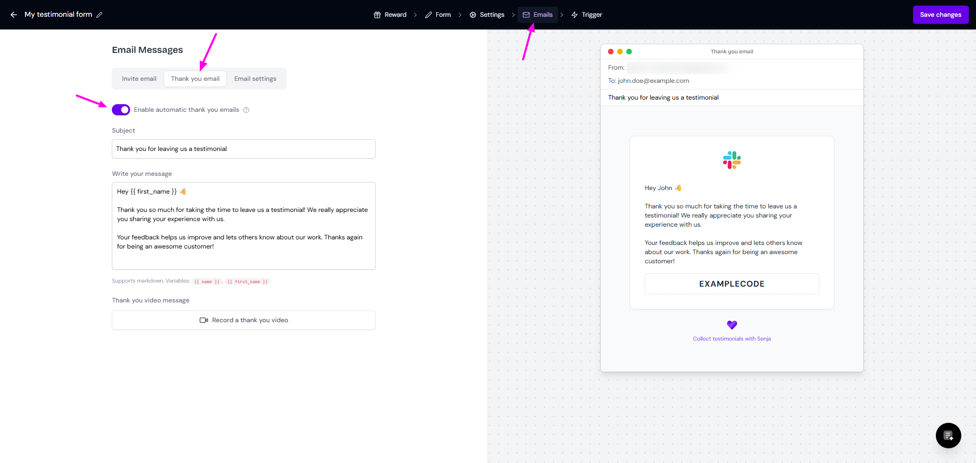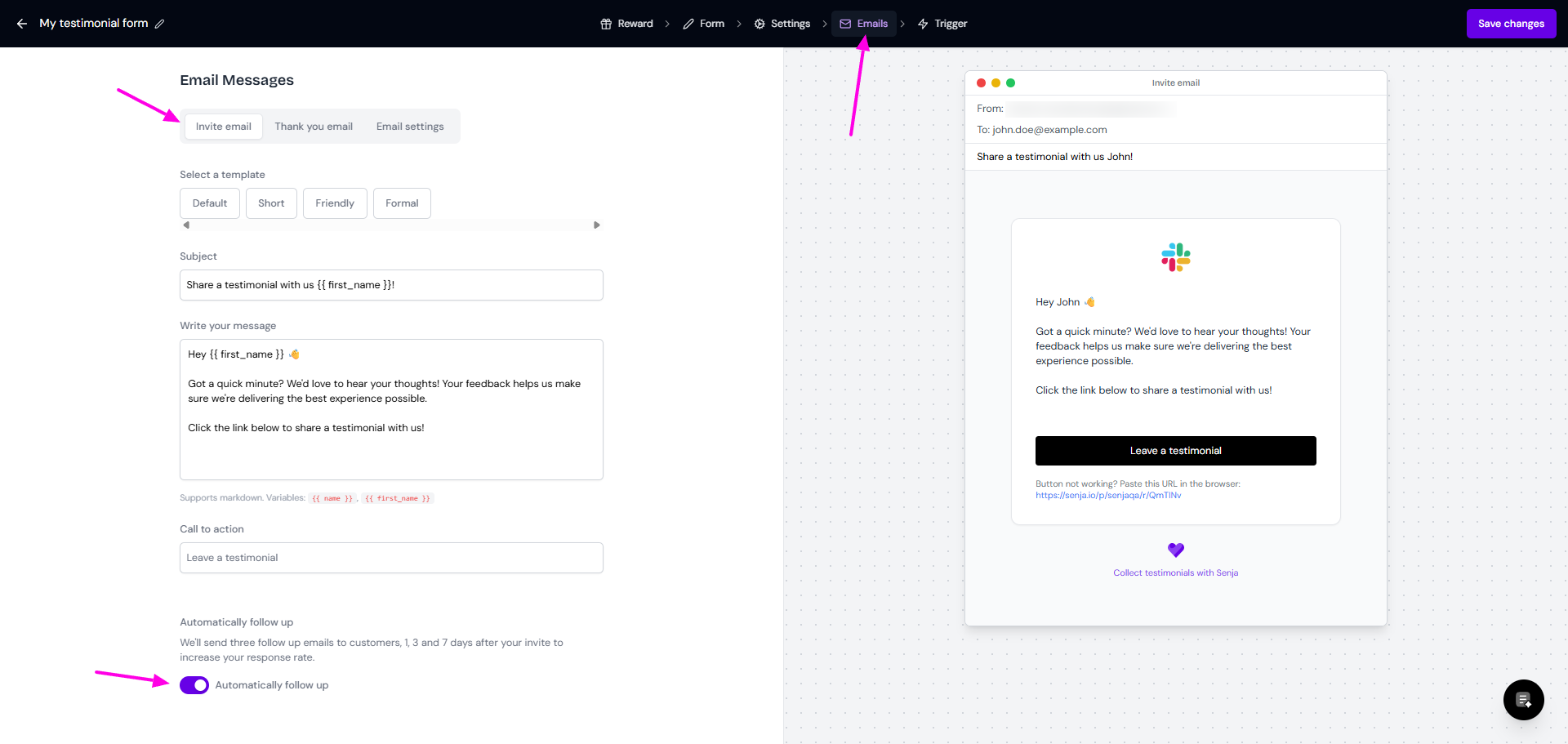 Set the Invite email, Senja will send this if you choose Campaign method on the Trigger tab - you can choose to enable email reminder/not