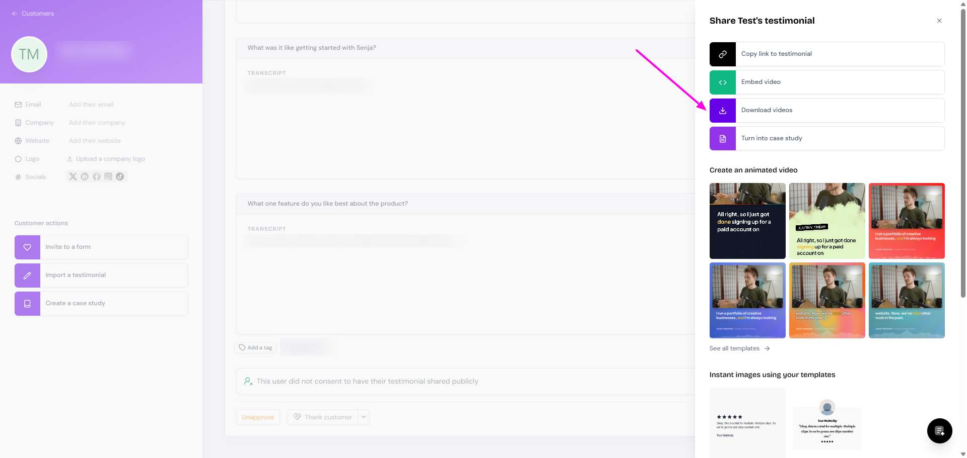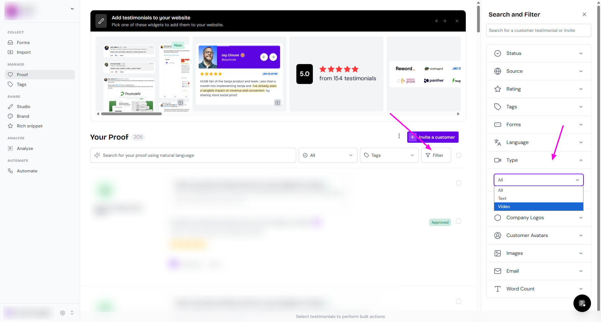 For bulk downloads: Filter by Video first, then select testimonials to export