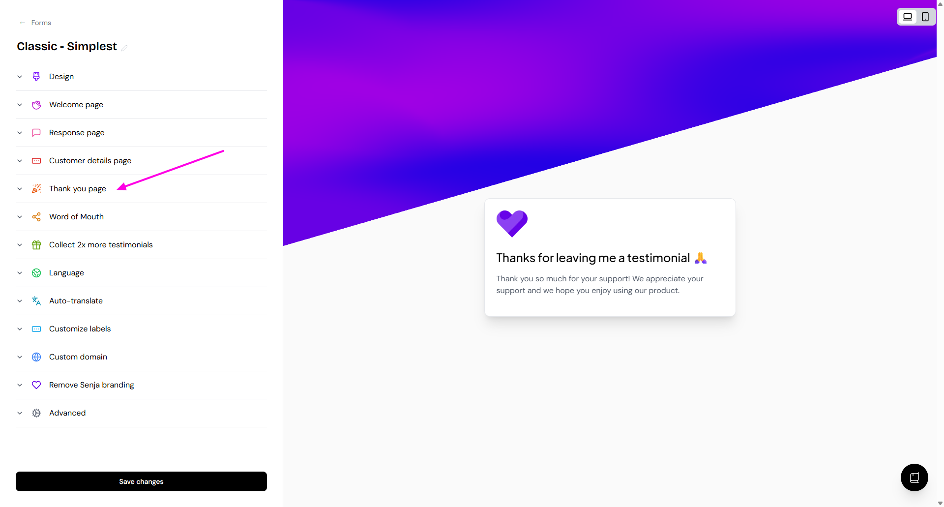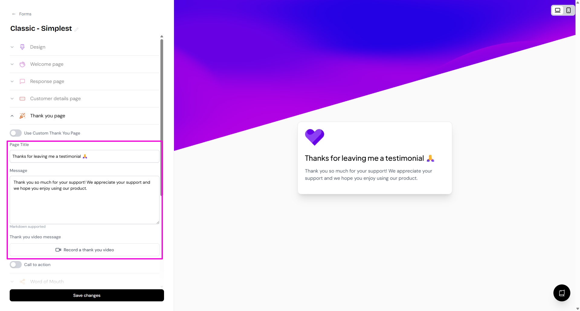 The thank you page is the final message your customers will see after submitting their testimonial in your form.