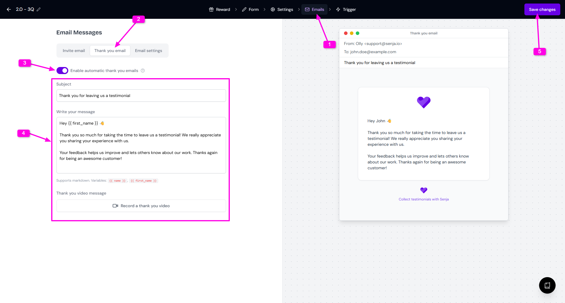 {{ first_name }}or{{ name }}to personalizeOptionally, Record a thank you video (paid plans only)