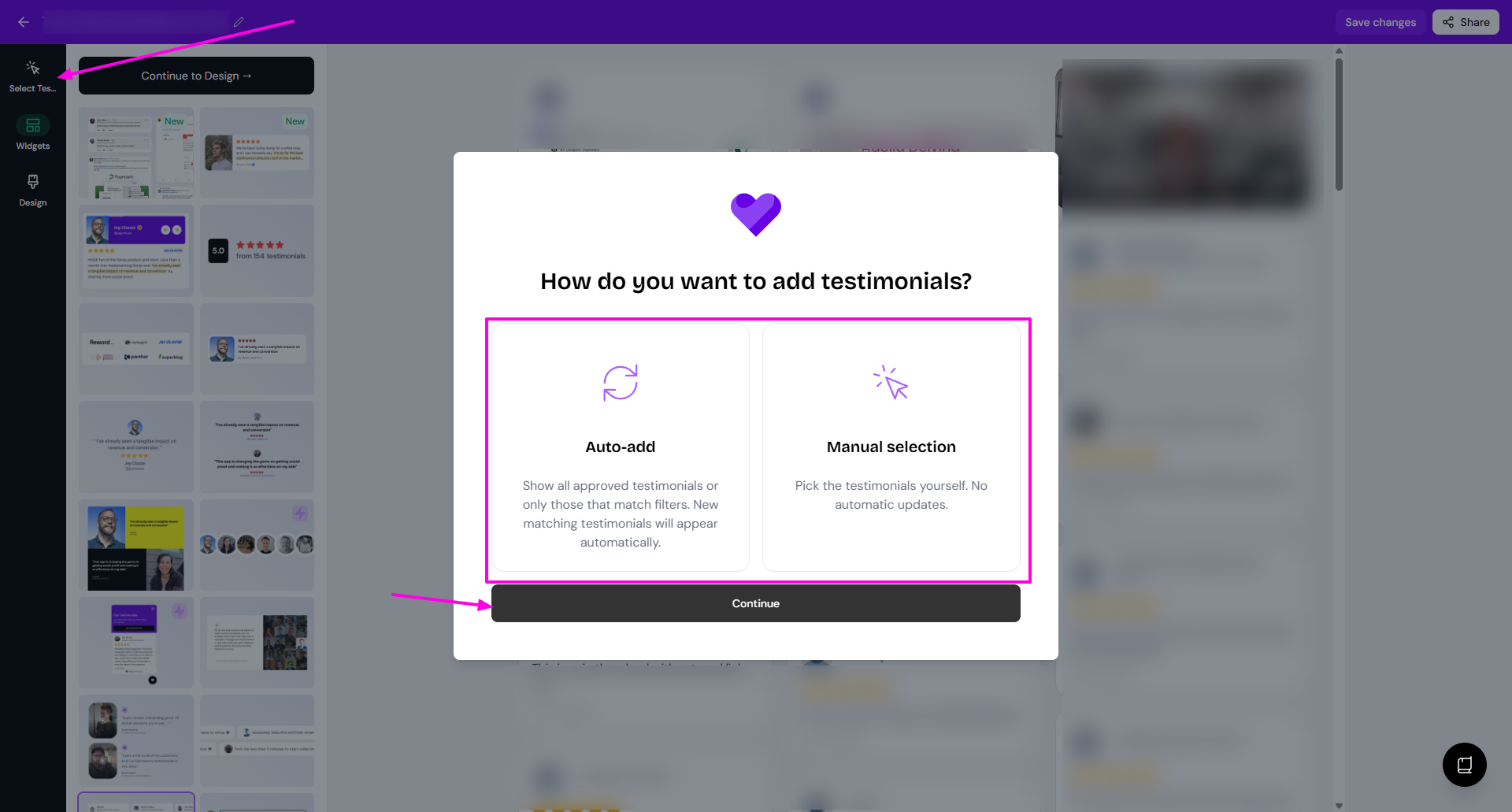 Manual selection — Hand-pick specific testimonials; the widget won't update when you receive new ones