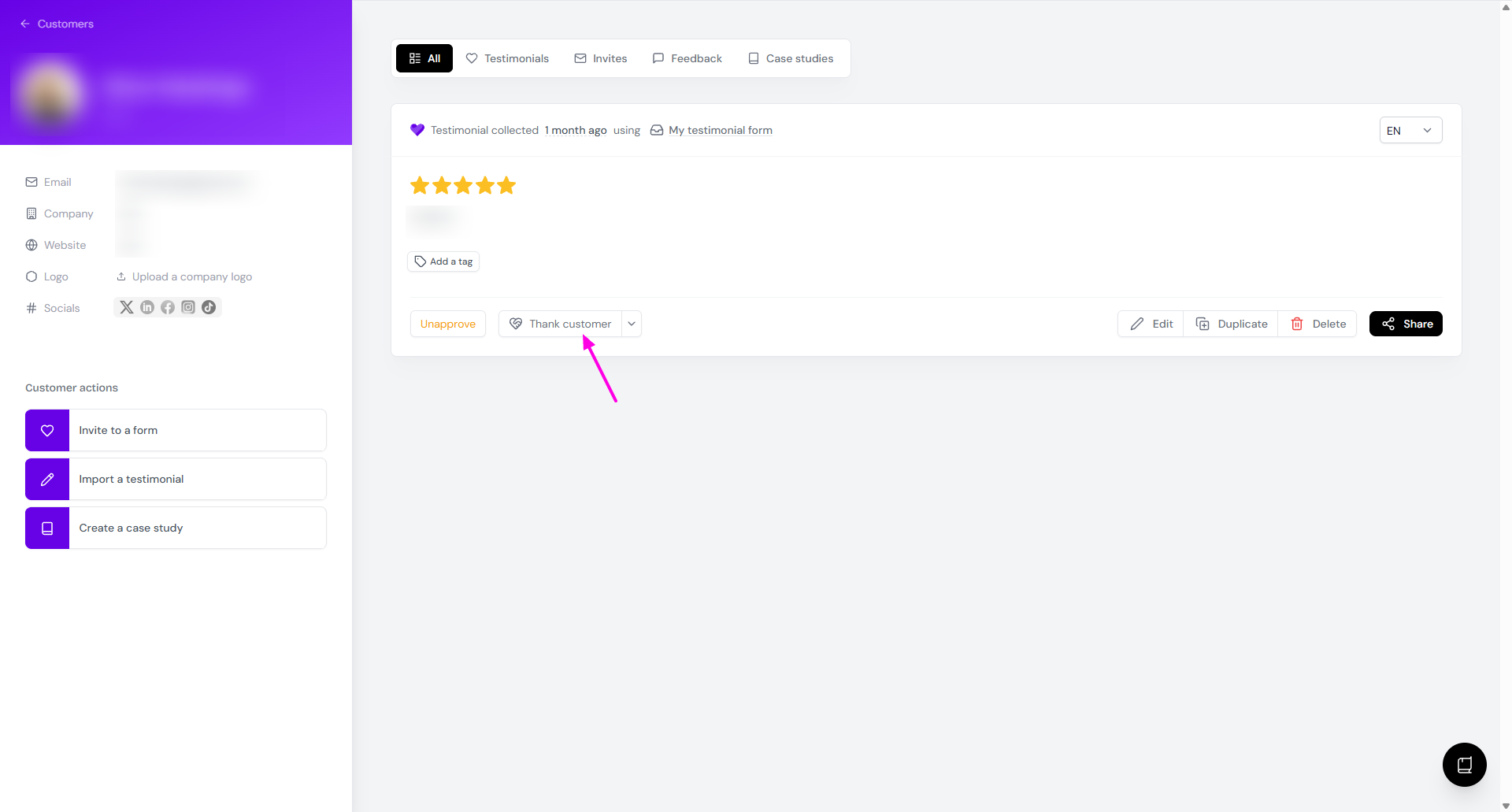 Record and send your customer a video thank you, and mark a testimonial as thanked