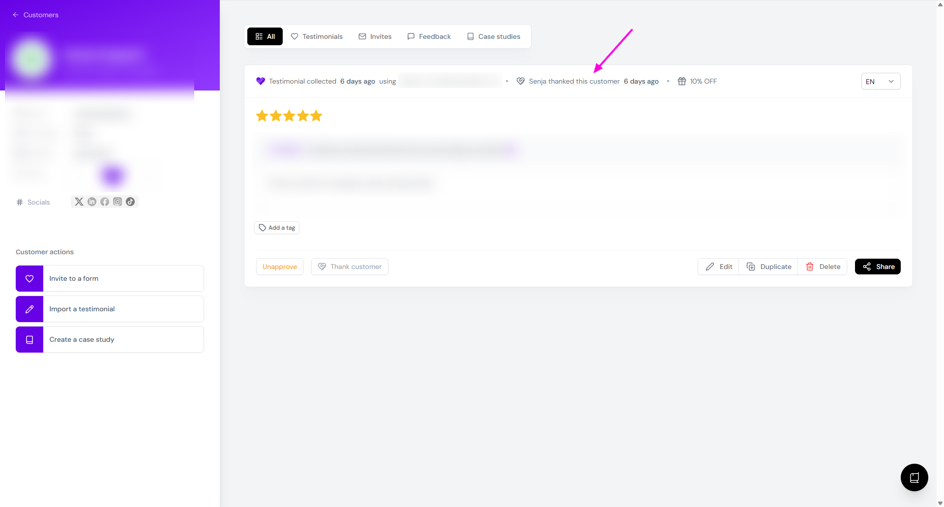 Or, mark a testimonial as thanked when you have thanked the customer outside of Senja