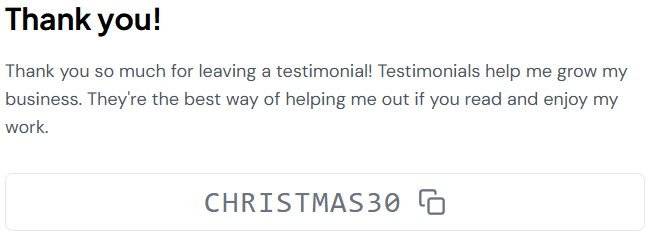 Want to sweeten the deal for people leaving testimonials? Coupon Code rewards let you offer a discount code right after someone submits. They'll see it on the thank-you screen and get it in an automated email too.