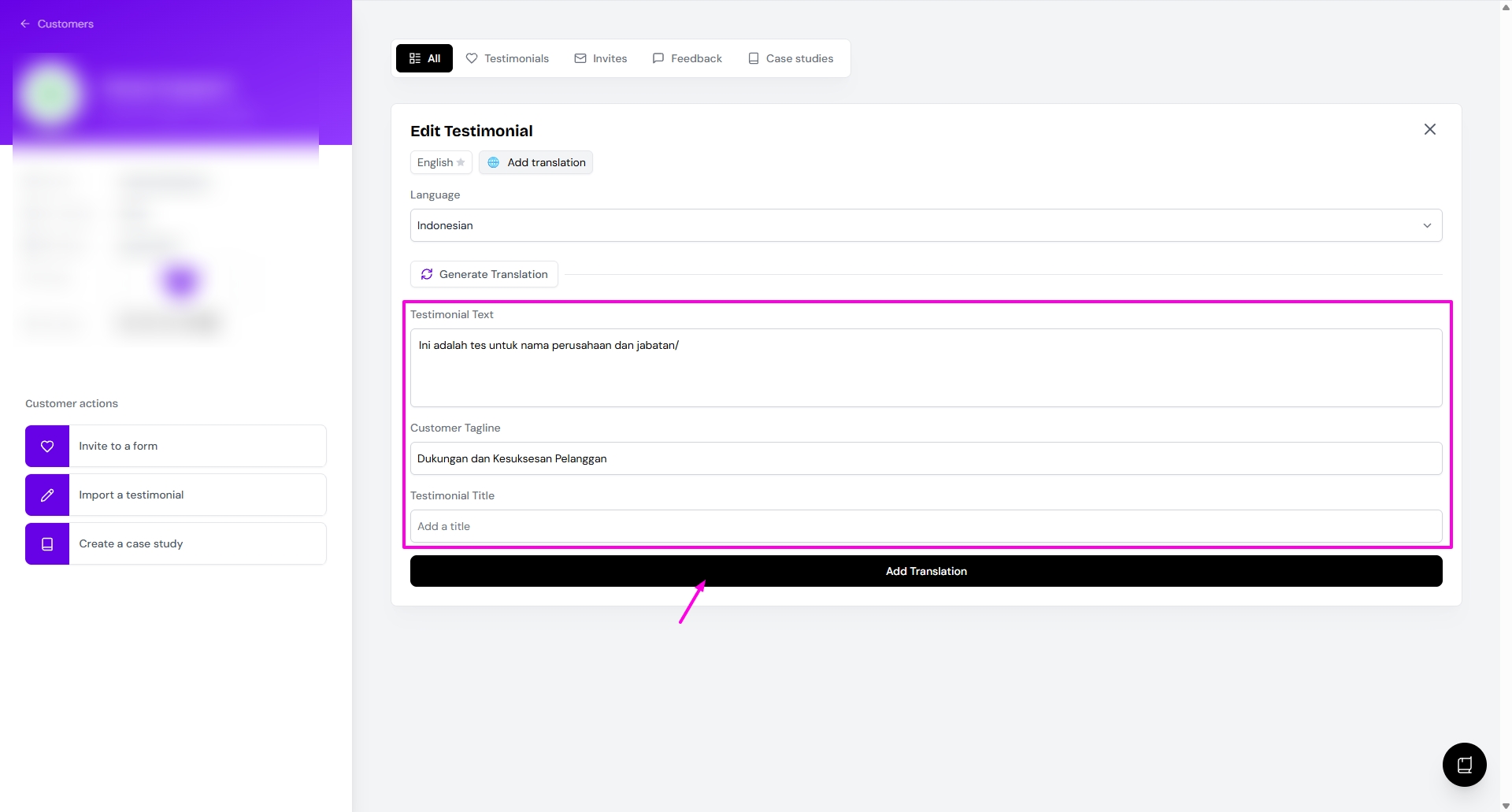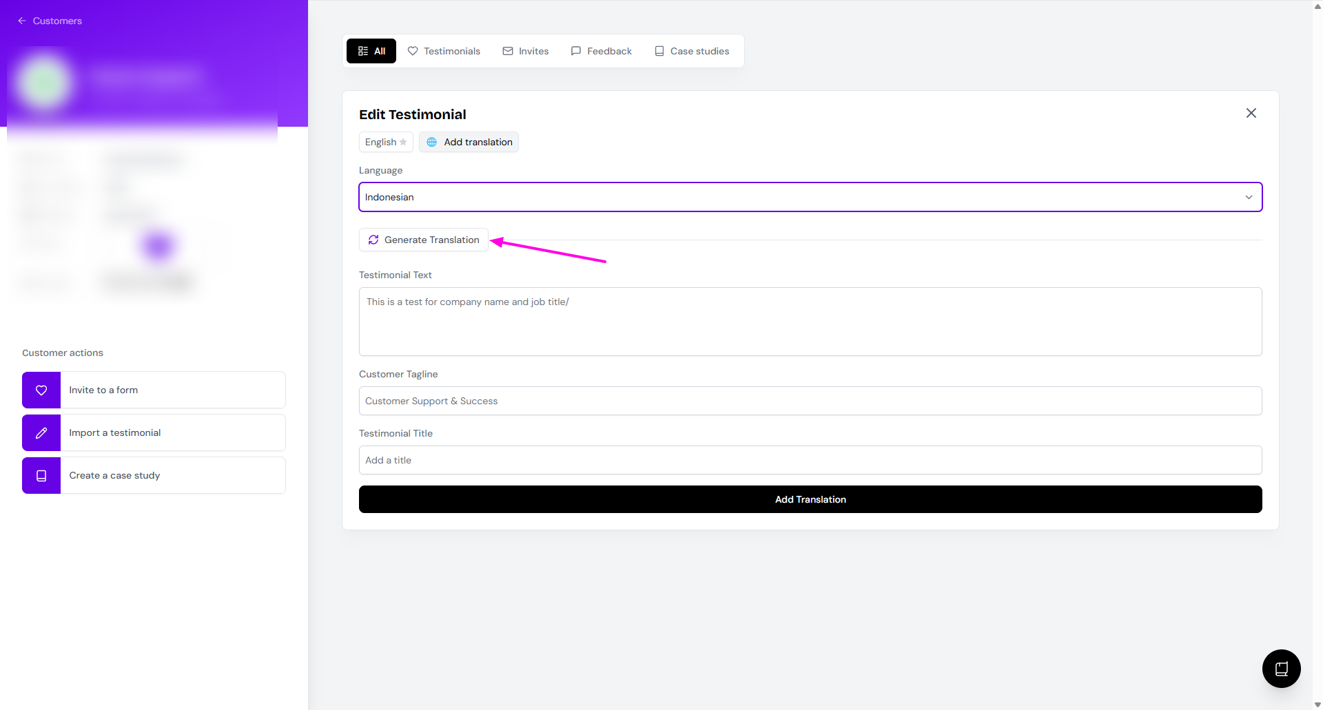 Before you begin: You need a Pro plan and at least one testimonial selected for translation.