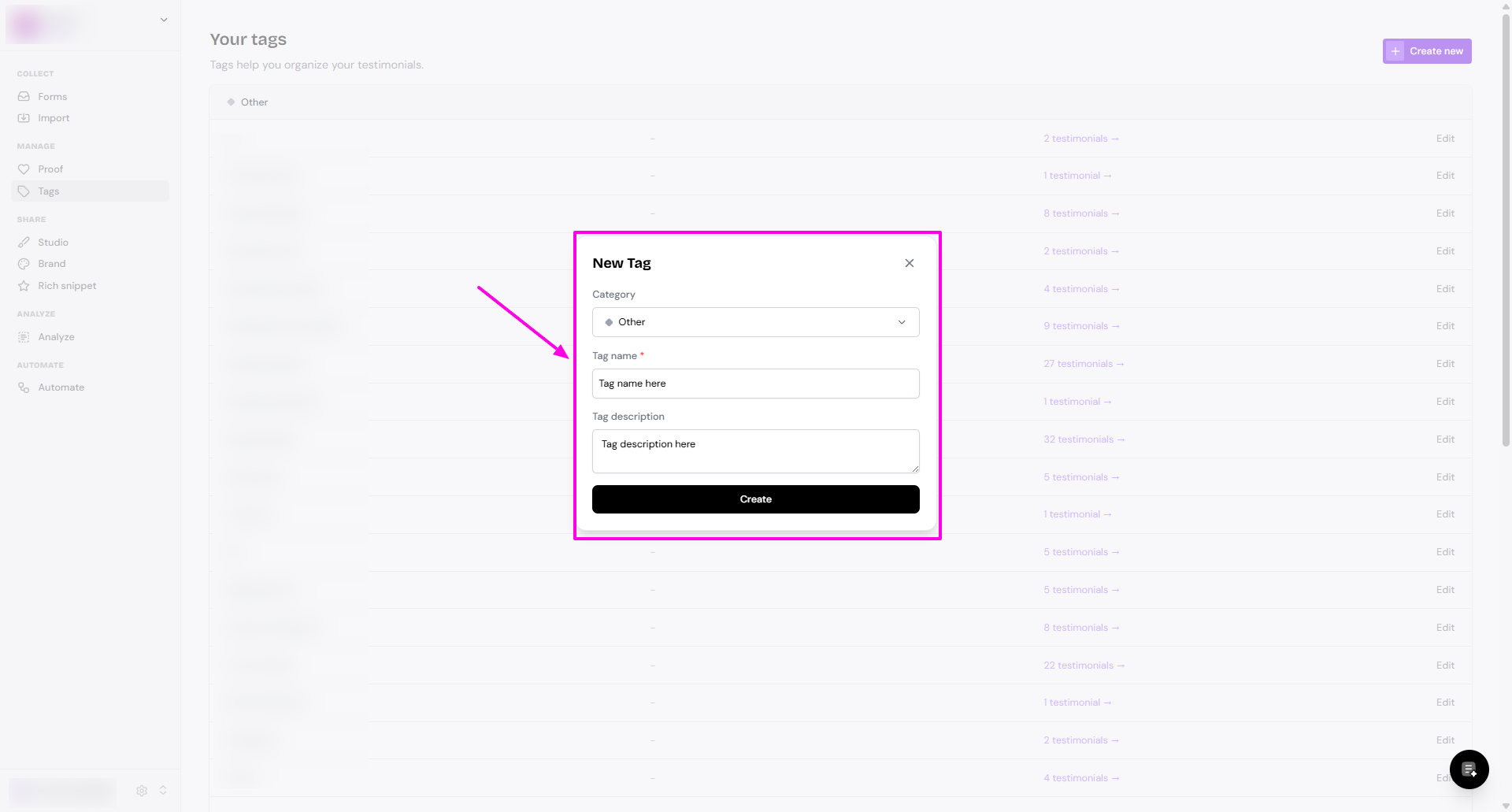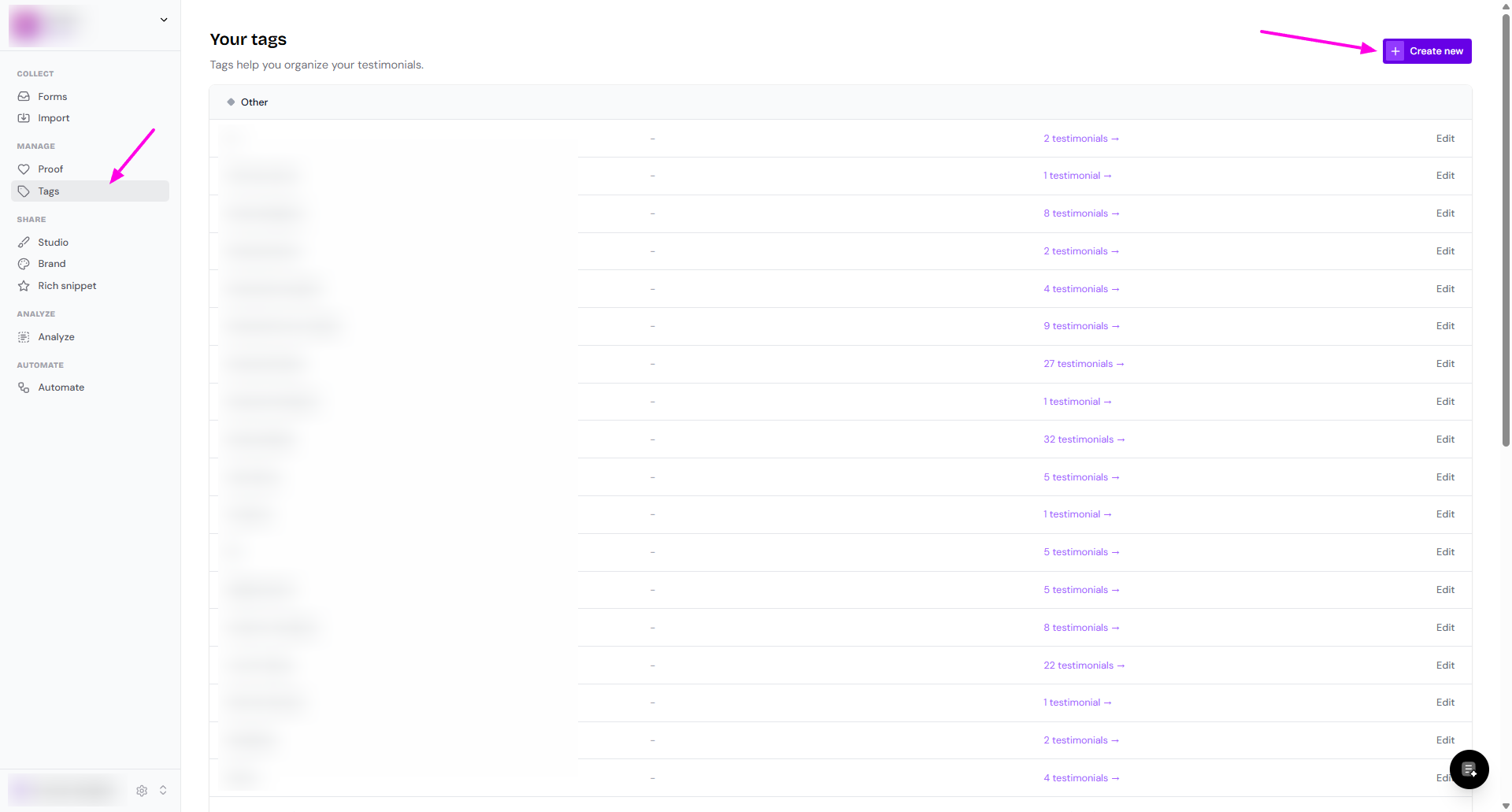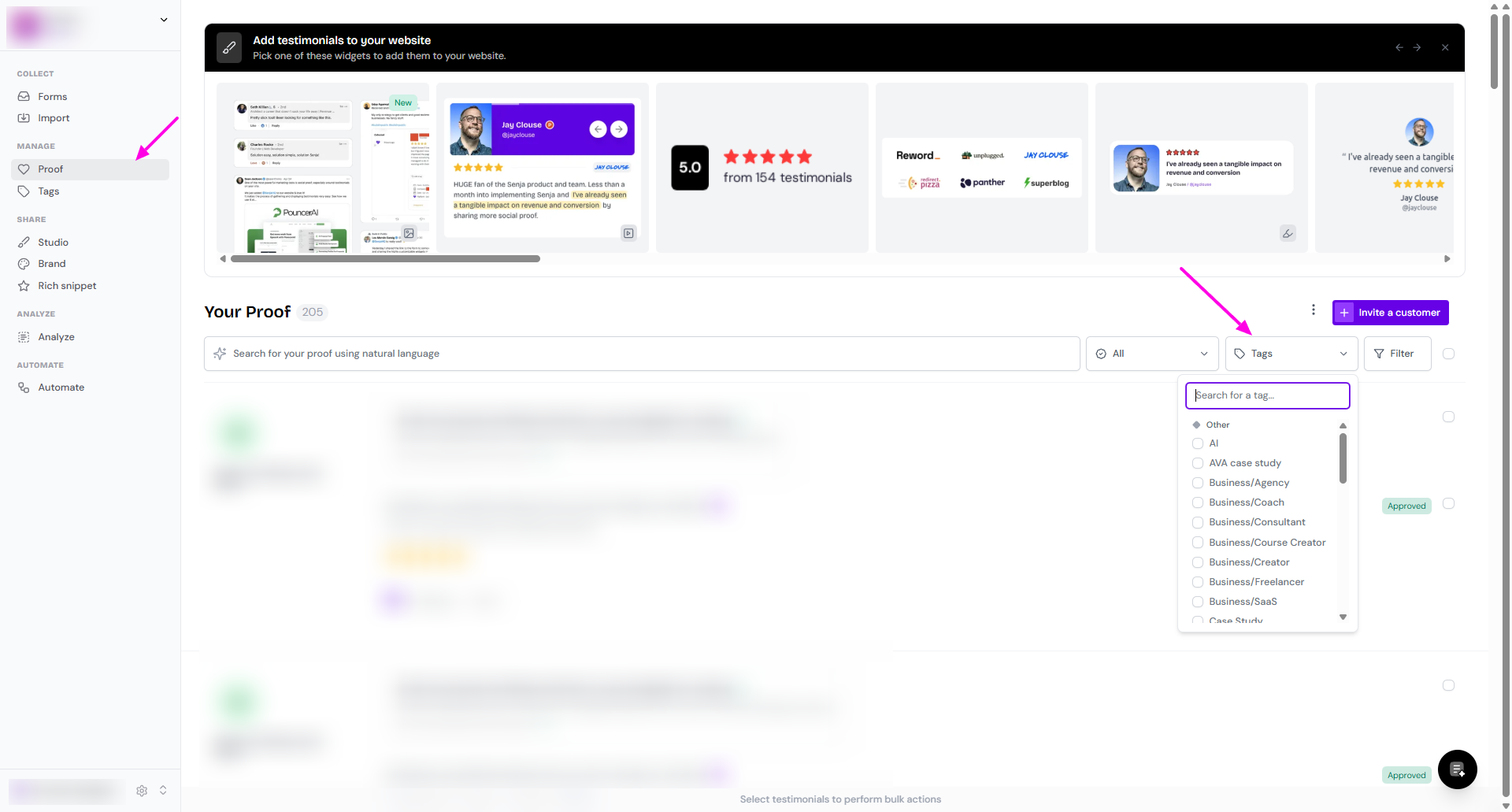 Tagging (or bulk-tagging) collected testimonials in Proof page: https://app.senja.io/