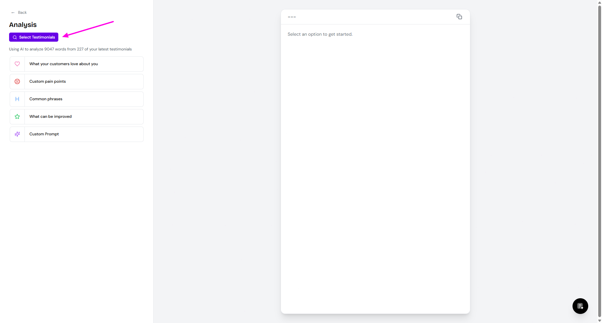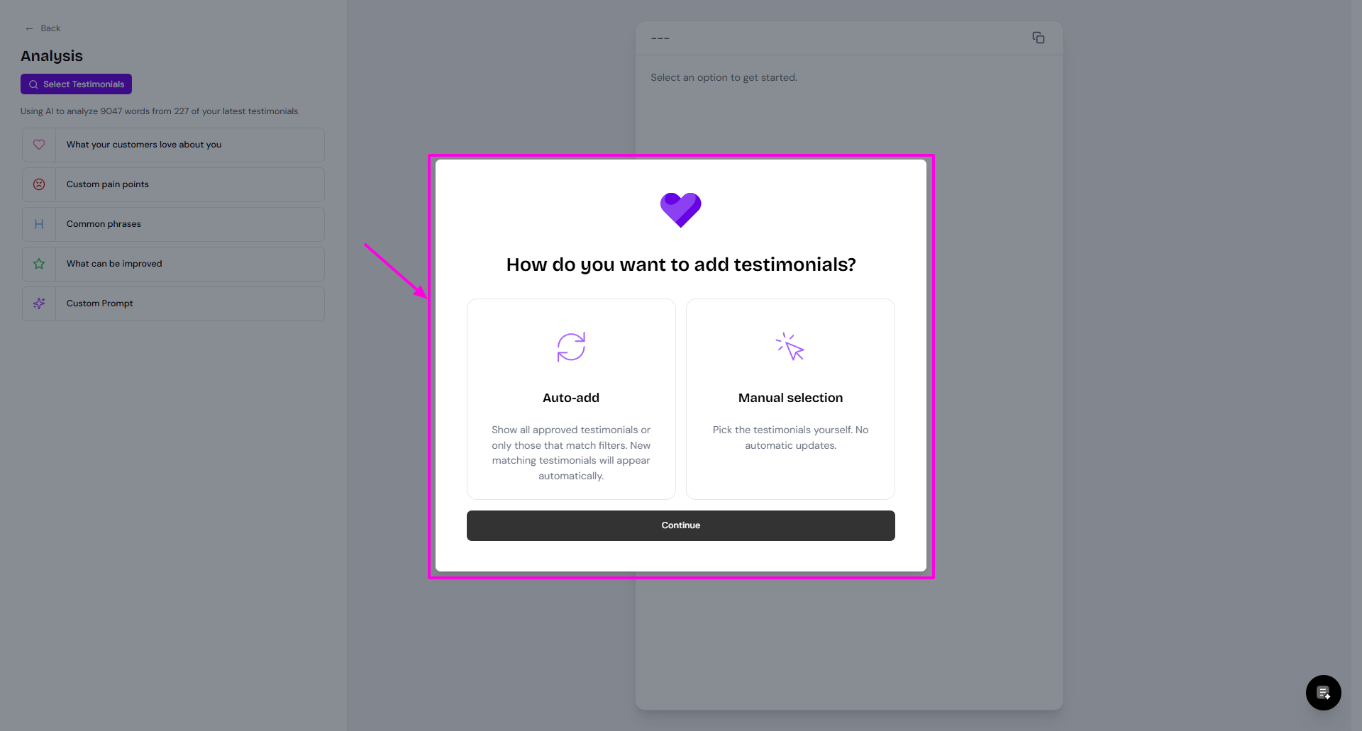 If you select by Auto-add, all testimonials matching the tag will be automatically added to the list to analyze