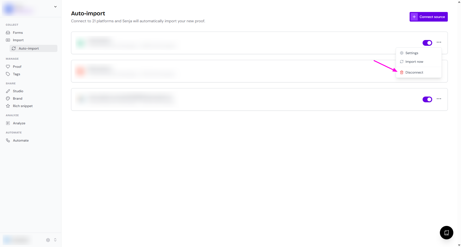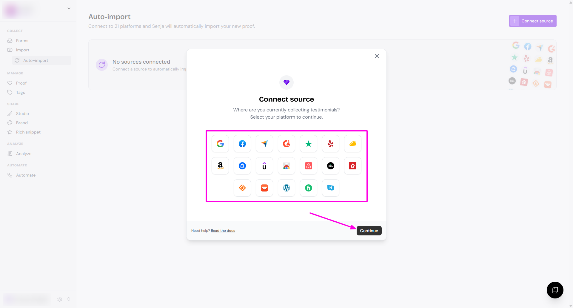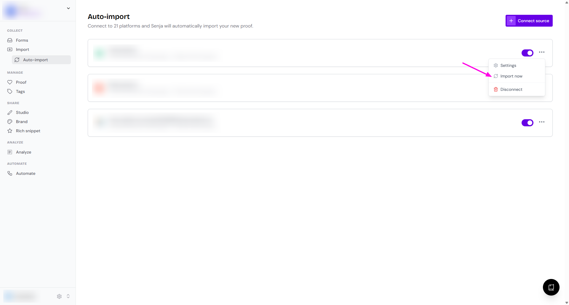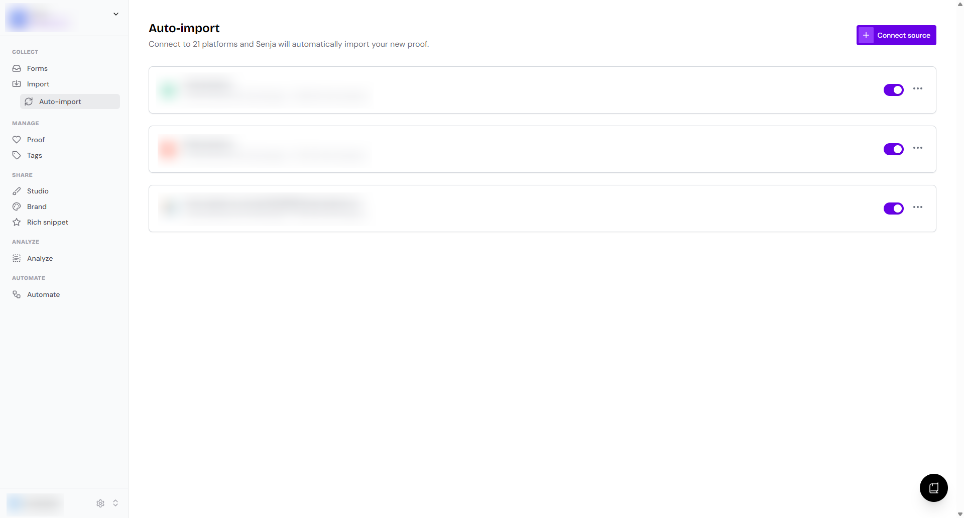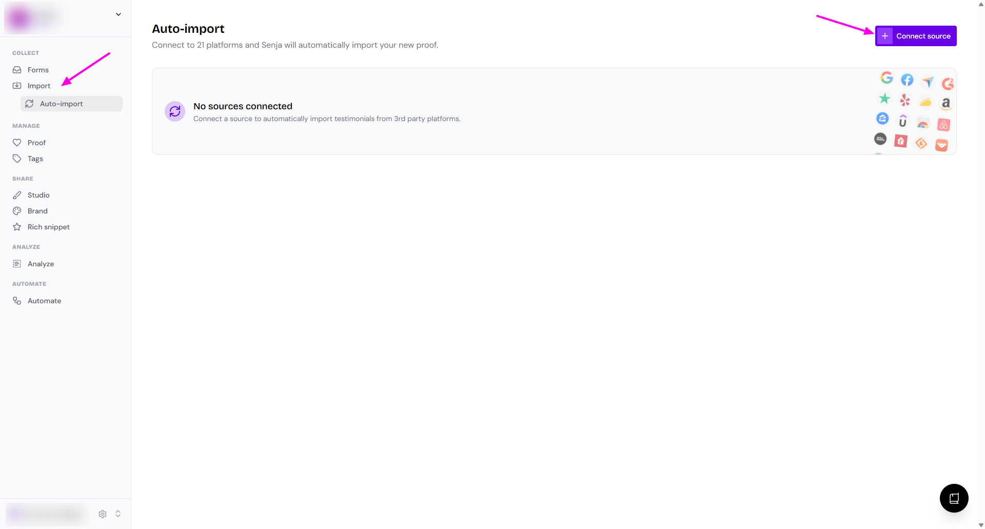 Go to your Import > Auto-import page: https://app.senja.io/import/auto