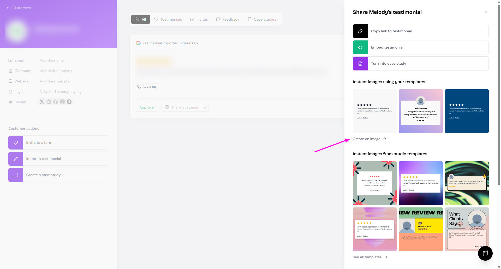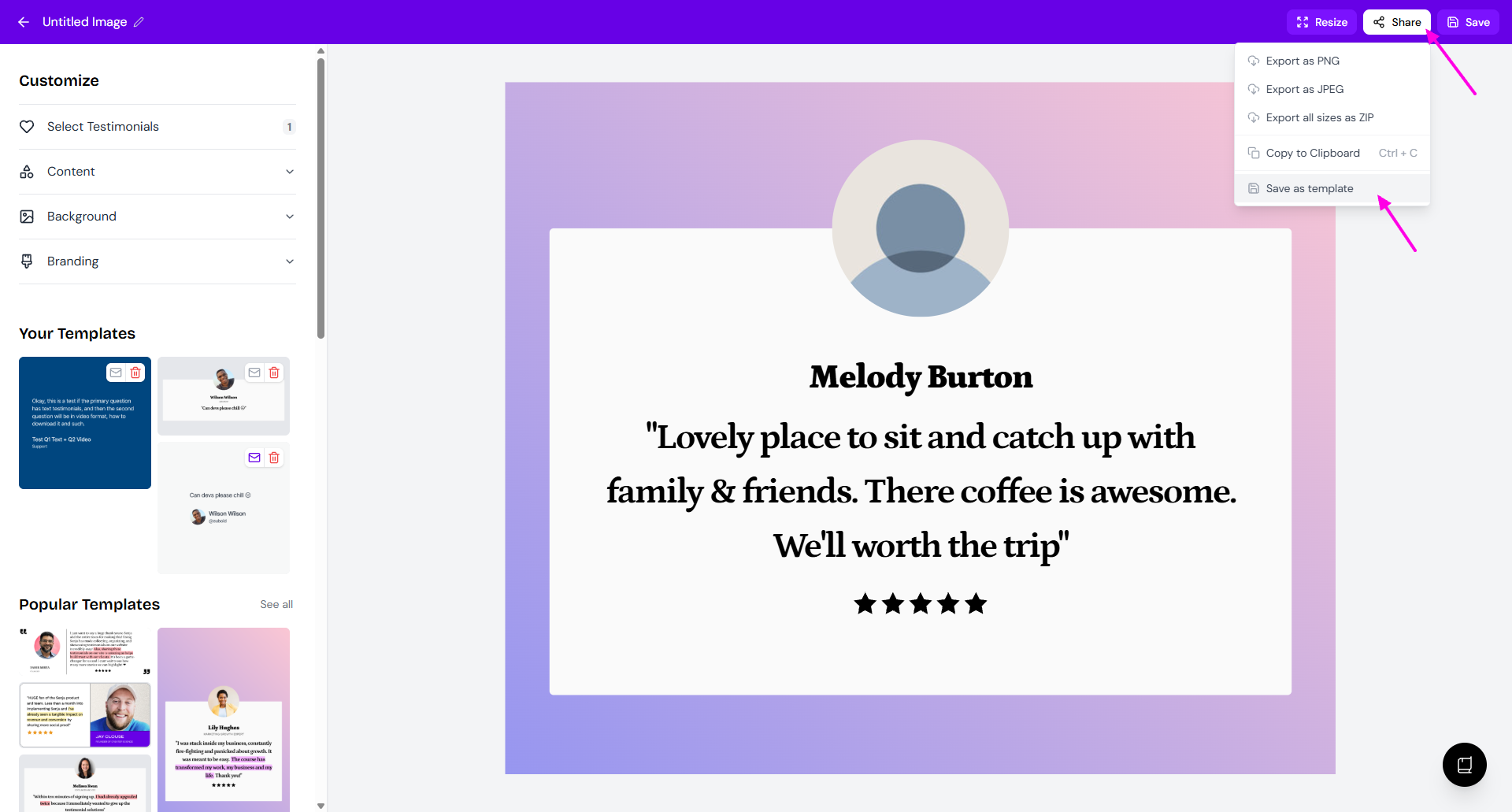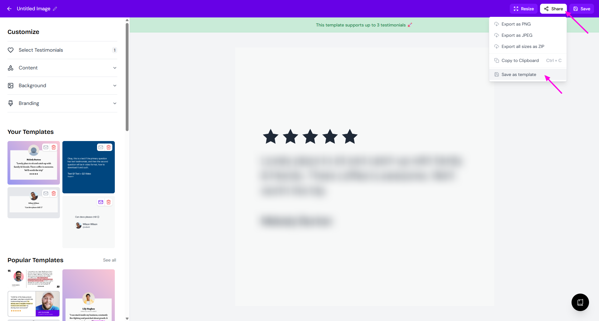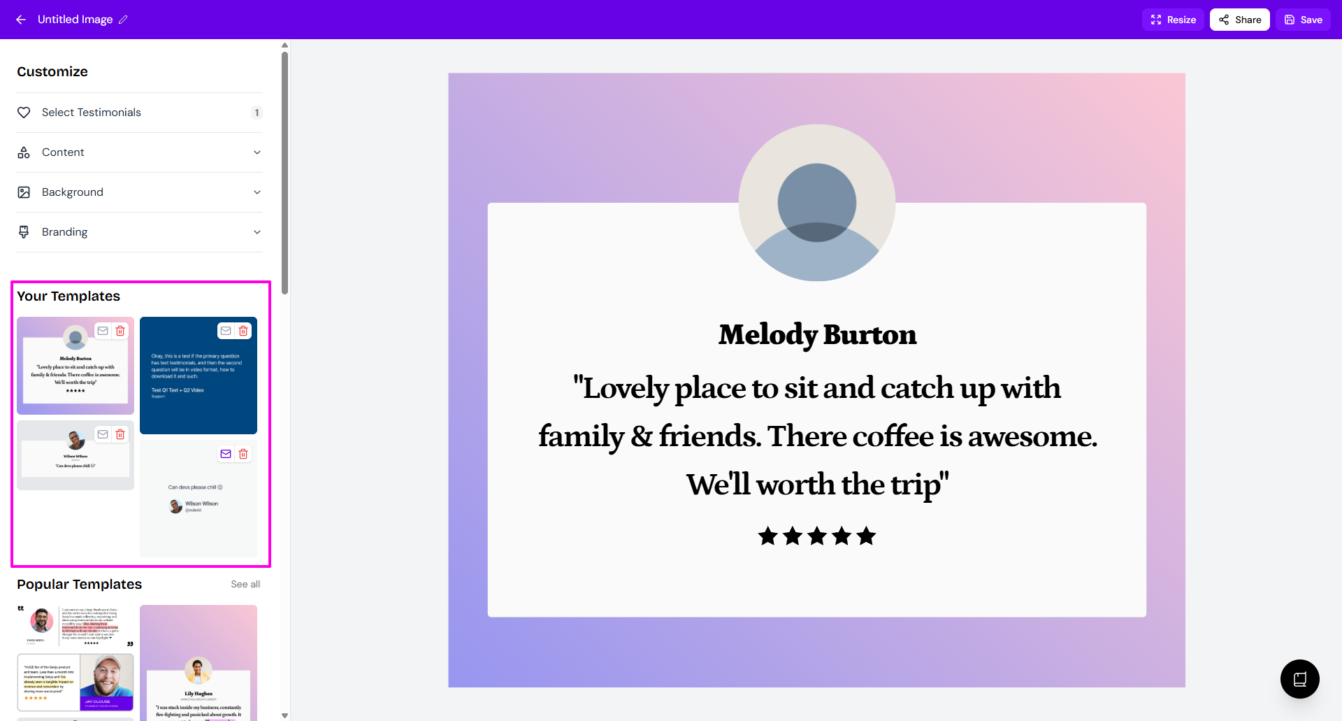 Image templates let you save your customized testimonial designs for reuse. Once created, you can apply them to new testimonials instantly without redoing your styling.