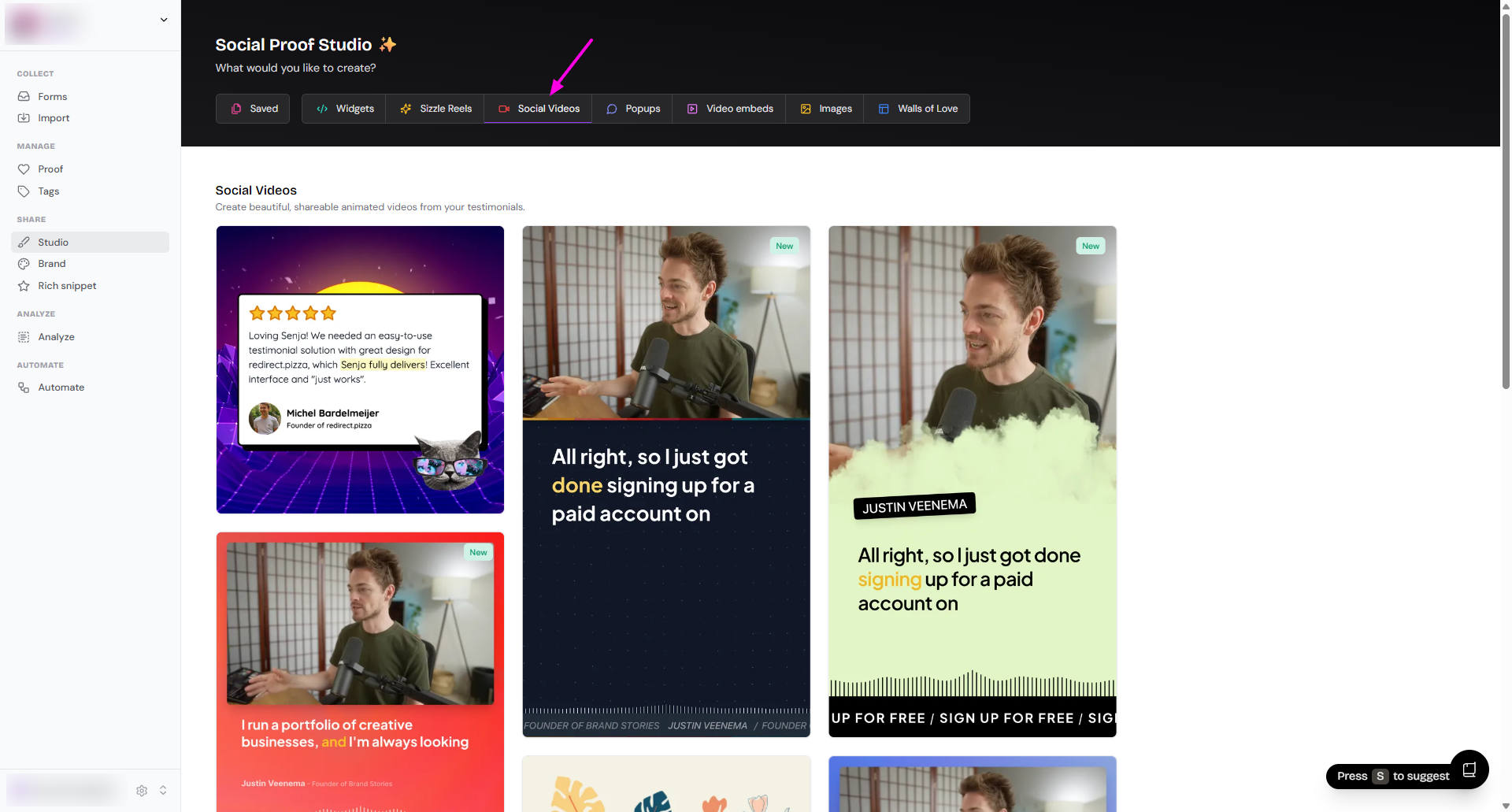 Social videos in Senja are short, engaging video reels created from your video testimonials for sharing on platforms like Instagram, TikTok, and YouTube Shorts.
