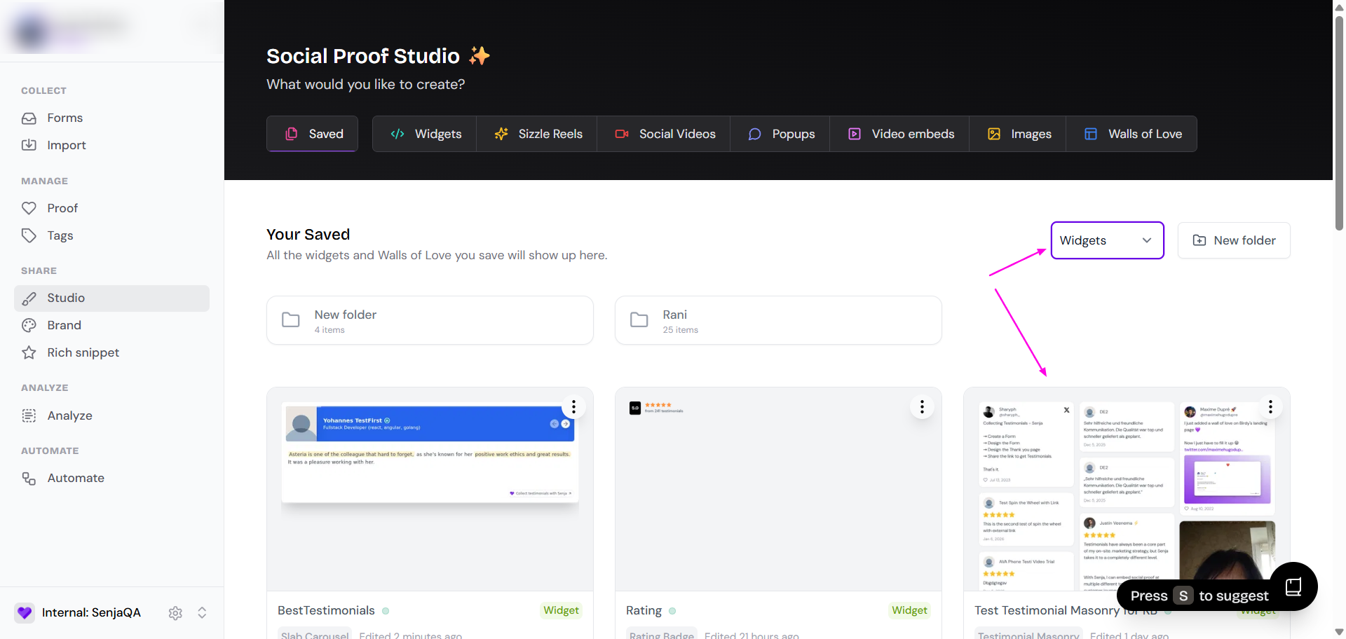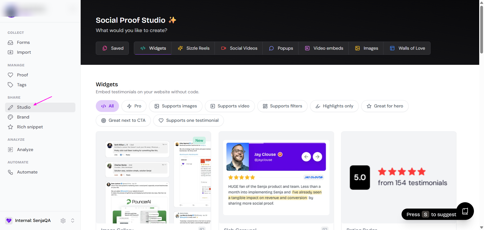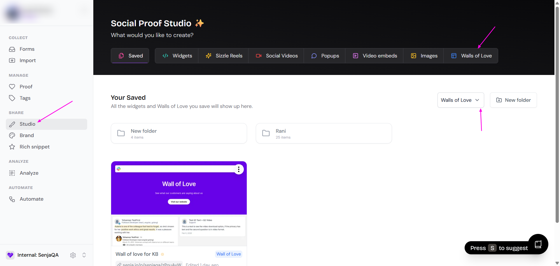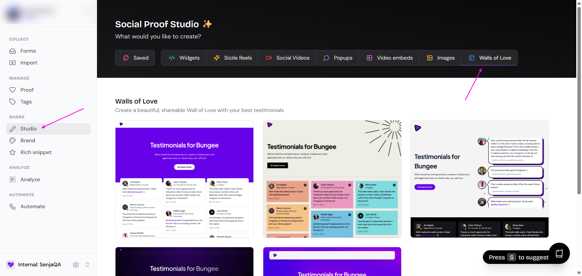 Note: The term "proofs" has been updated to "Social Proof Studio", which includes Walls of Love and Widgets.