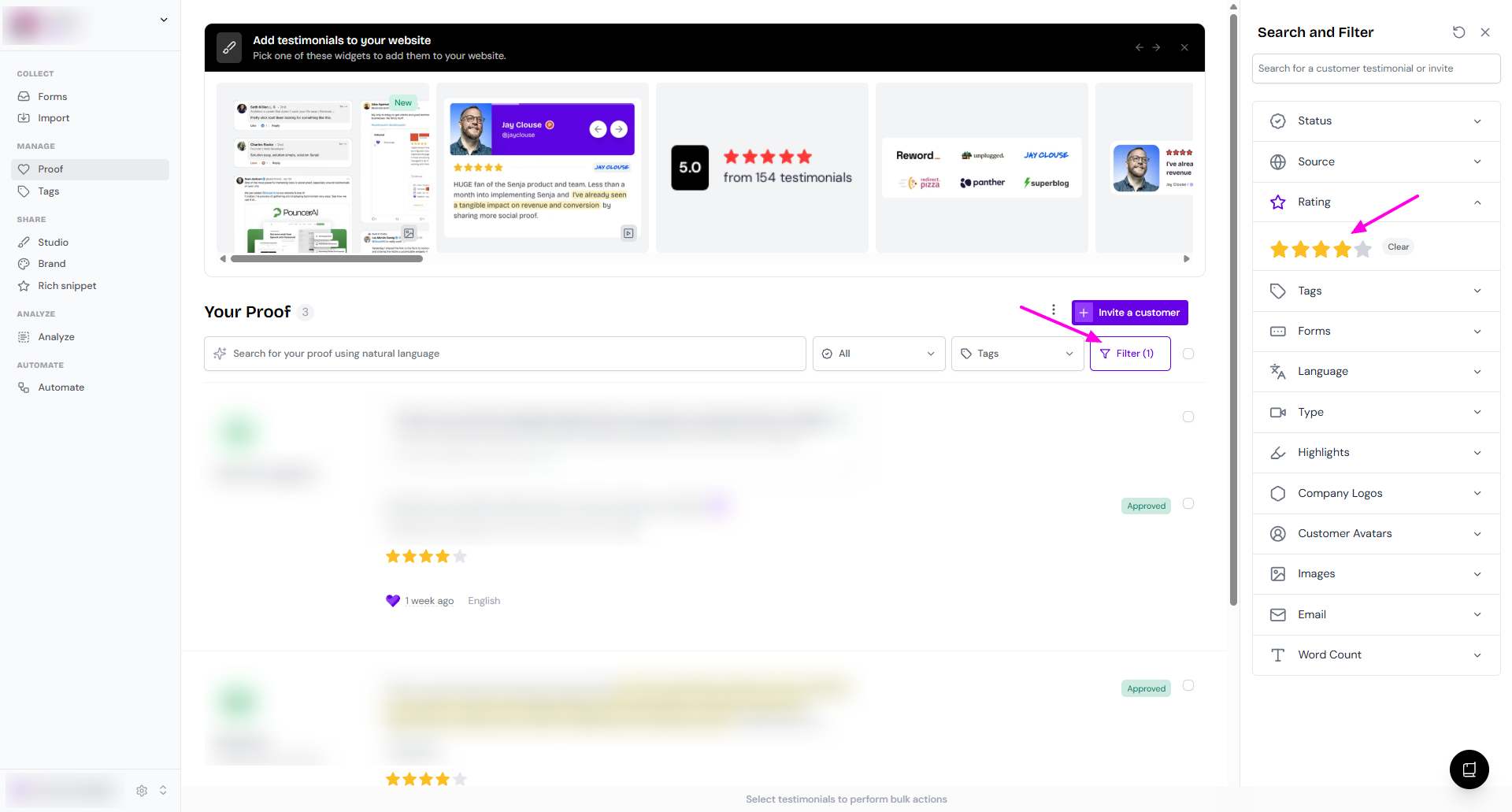 If you choose Manual selection, all testimonials with the chosen rating will be shown in the preview, you can cherry-pick which ones you want