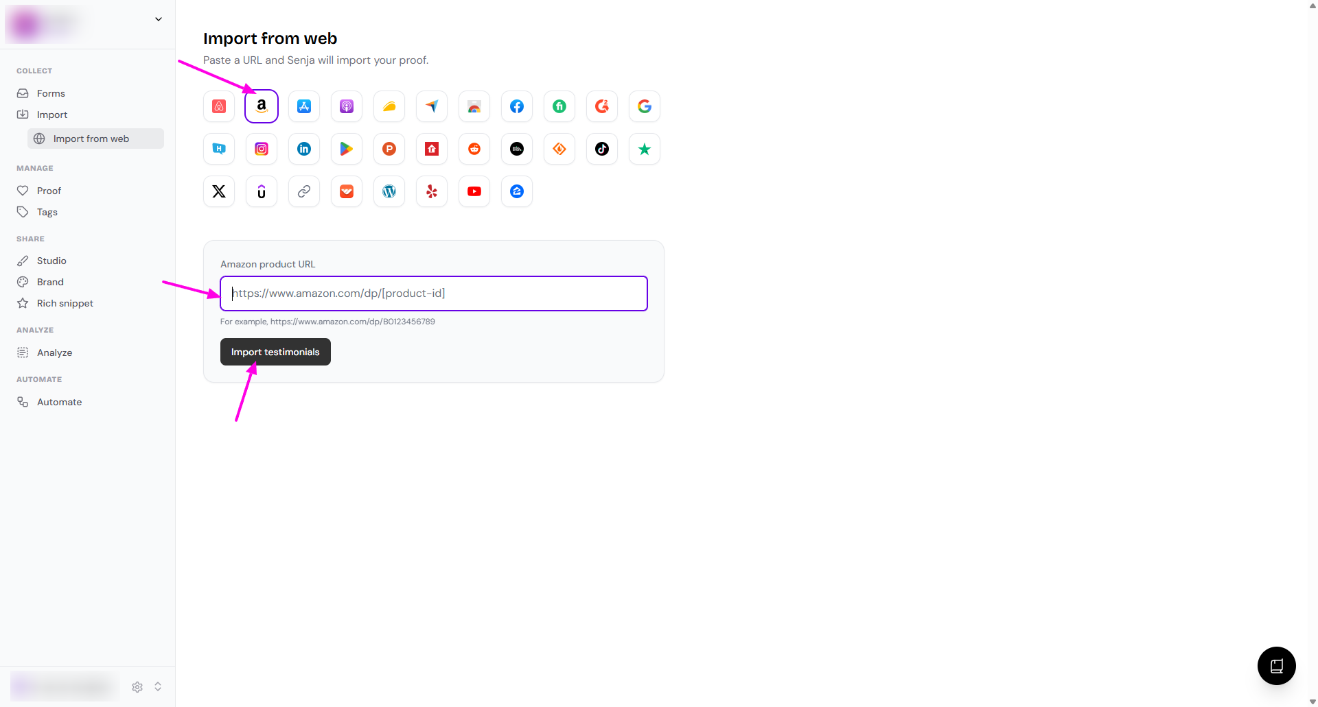 Senja lets you import product reviews from Amazon and automatically sync new ones as they come in.