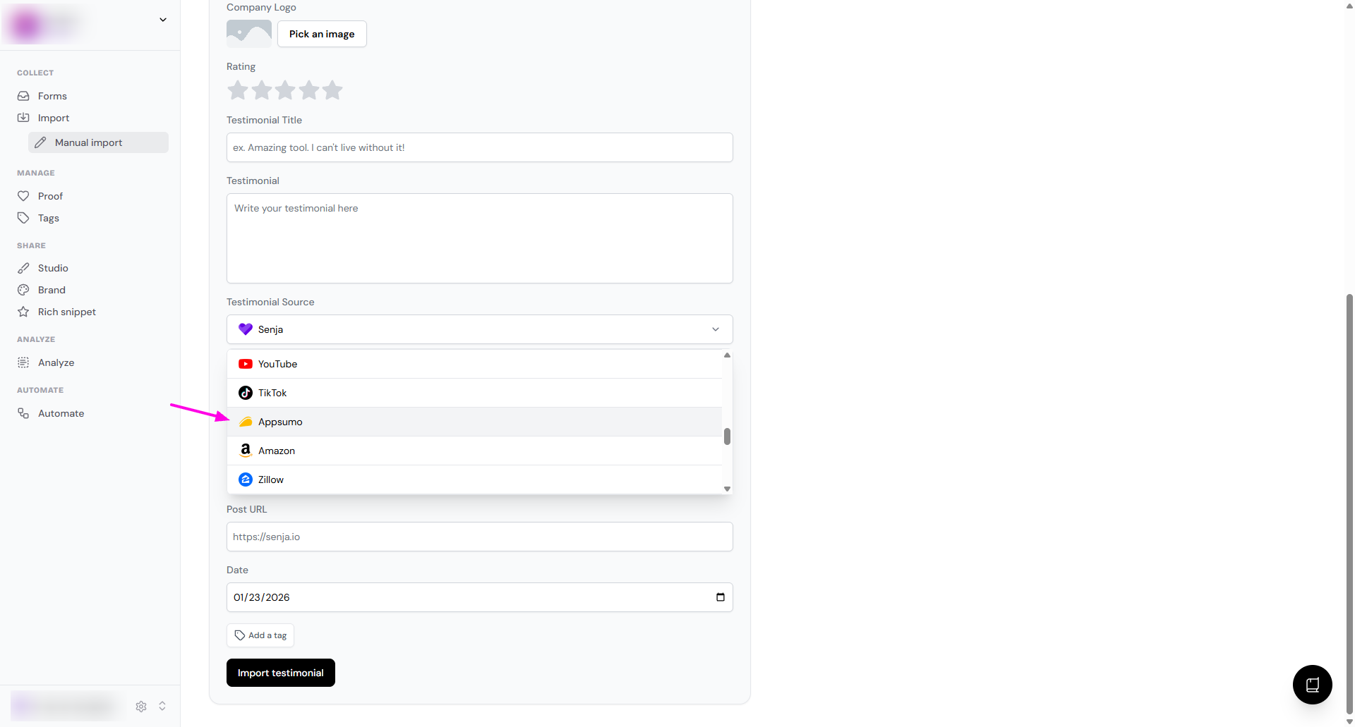 Import your AppSumo reviews into Senja so you can share them as social proof.