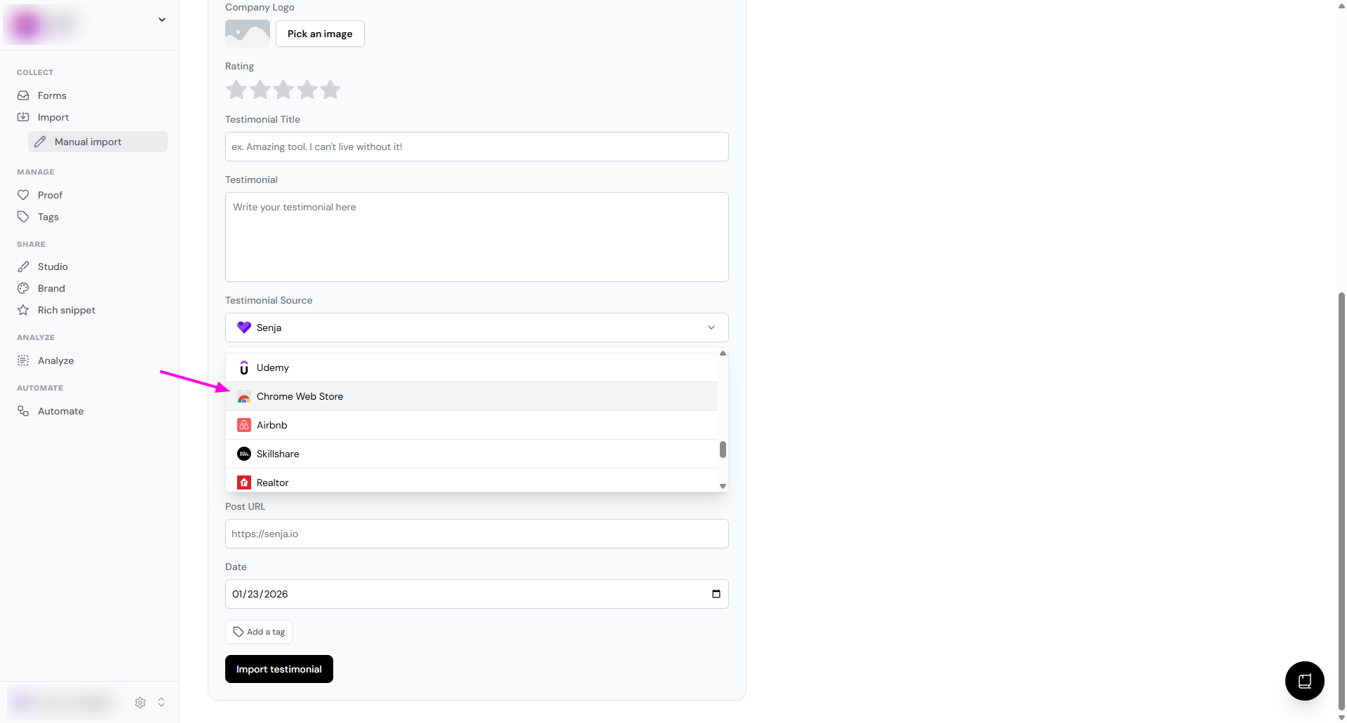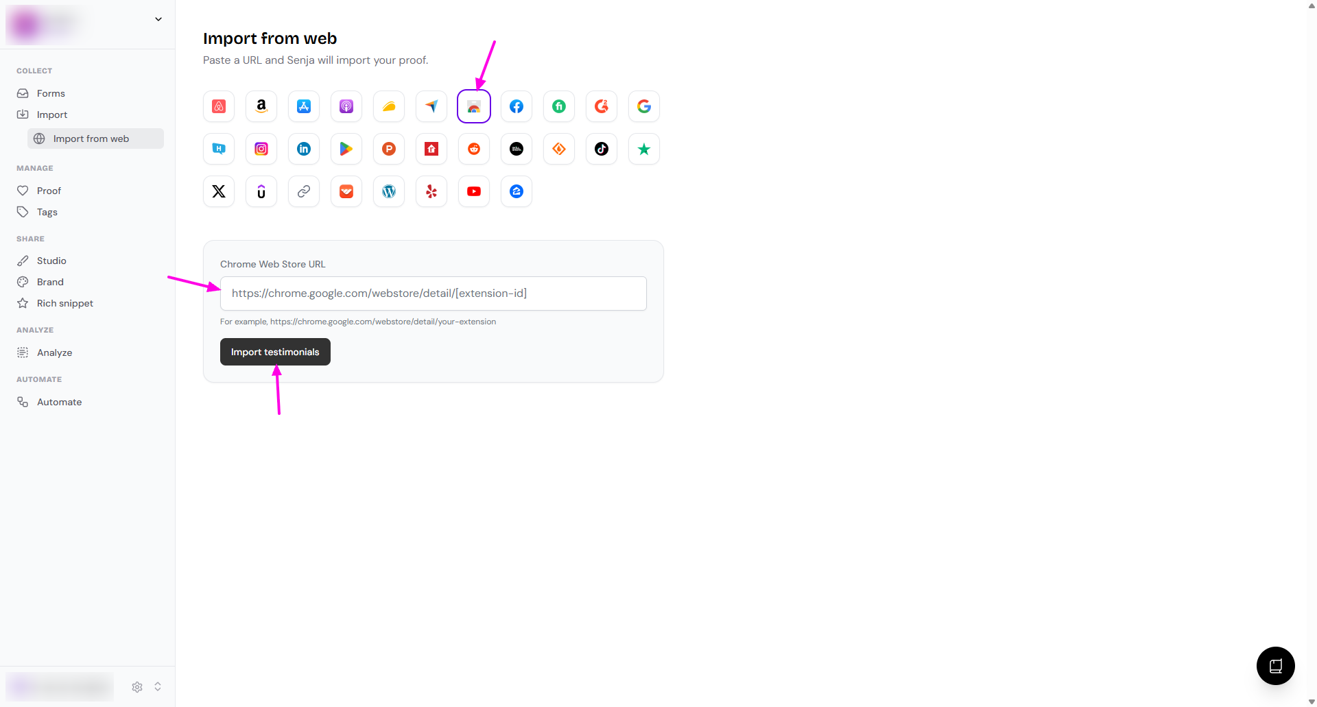 Use the Chrome Web Store importer to pull reviews from your extension listing into Senja.