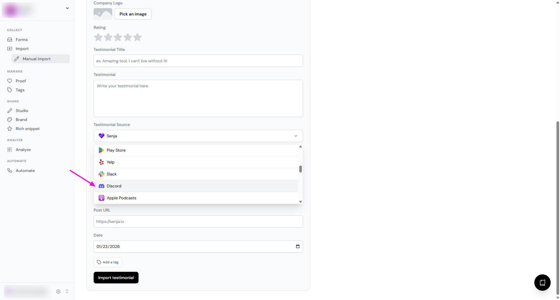 In the Testimonial Source dropdown, choose Discord