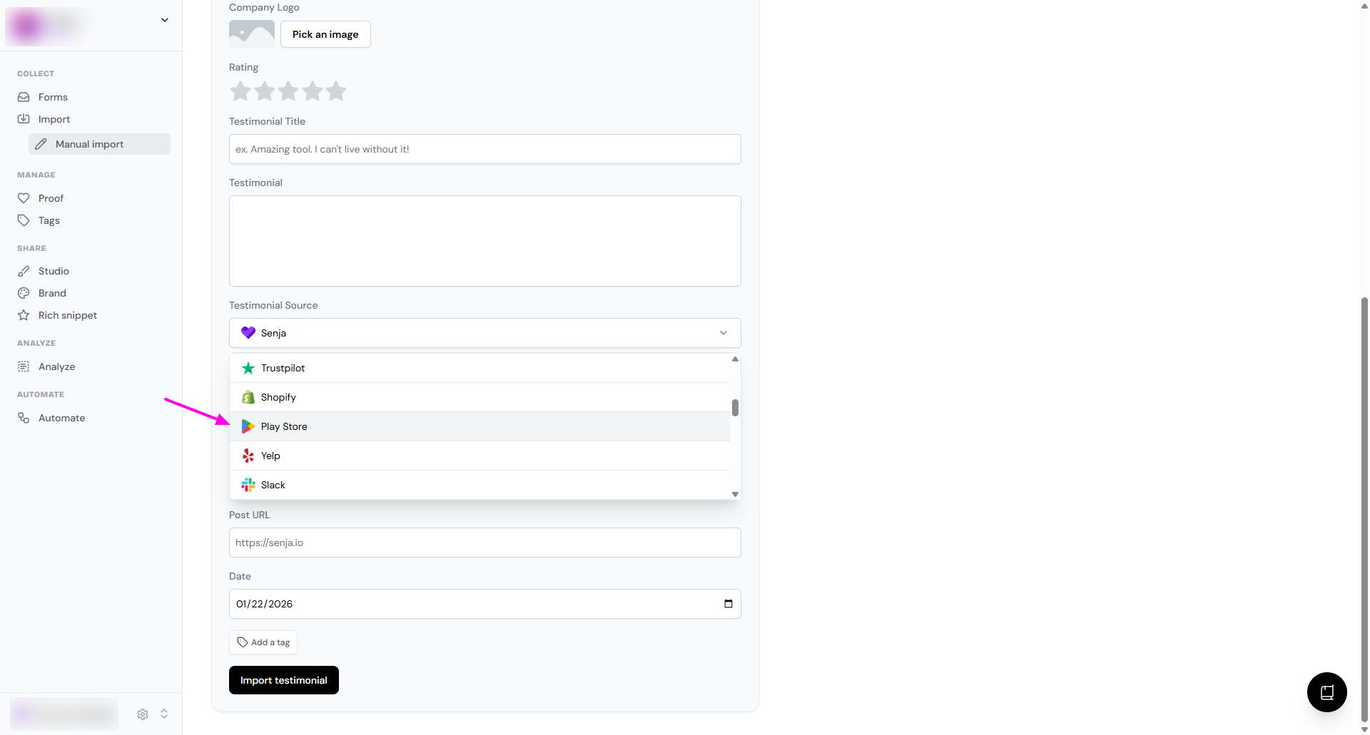 Go to Import > Import from web: https://app.senja.io/import/web