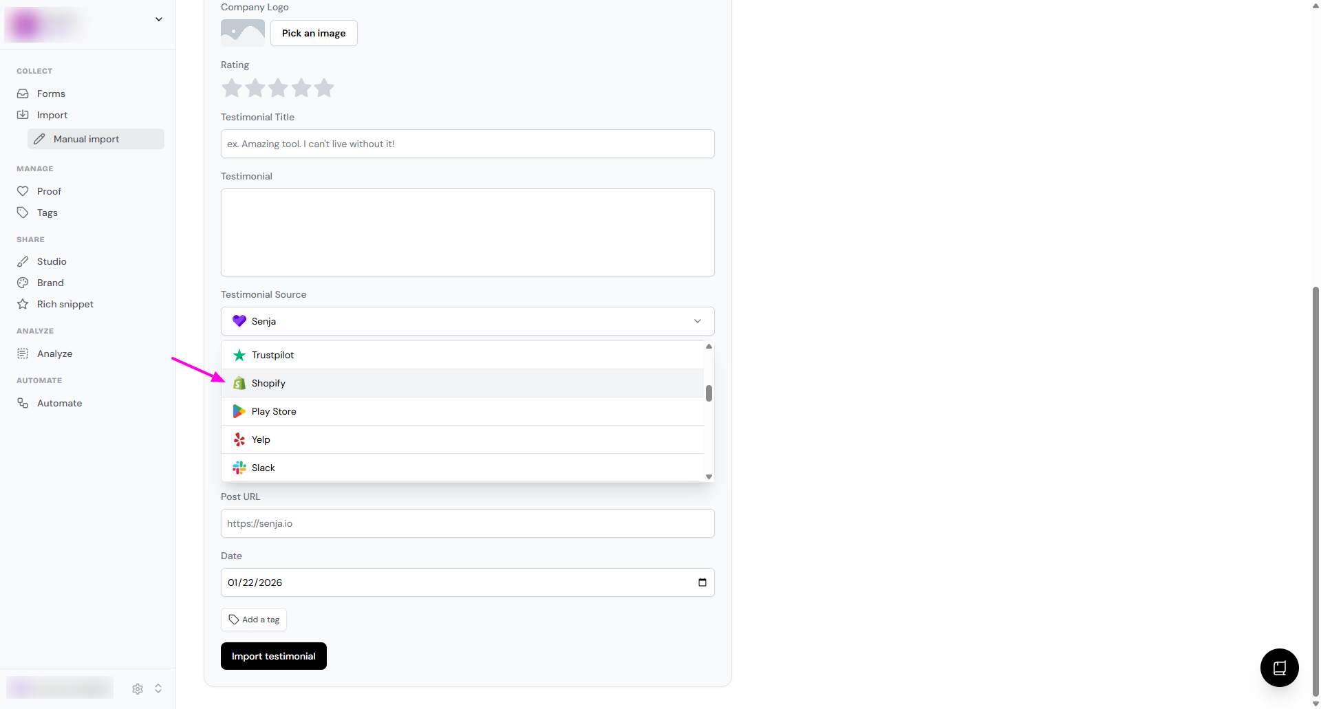 Senja lets you import product reviews from Shopify to use as testimonials and social proof.