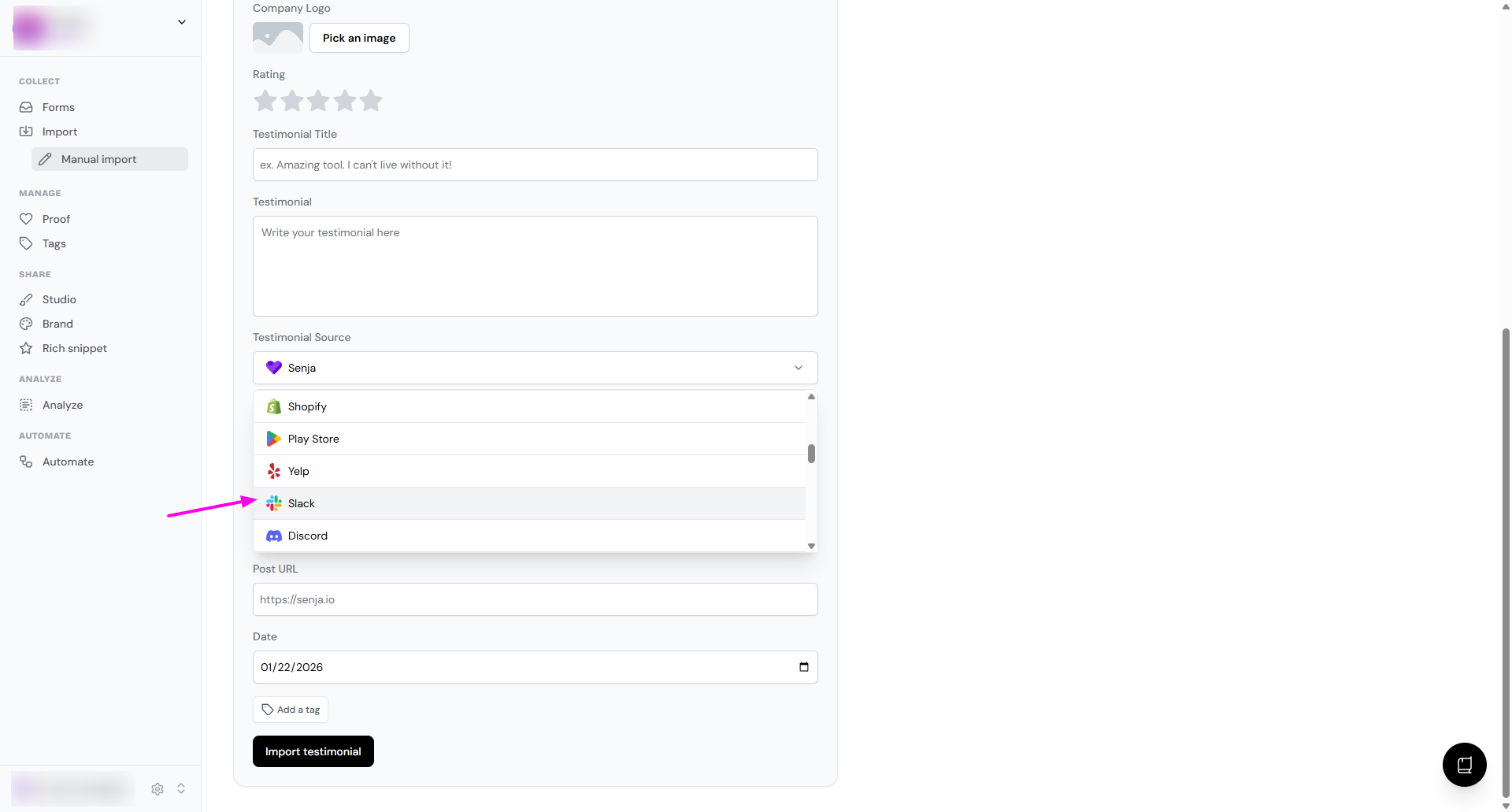 In the Testimonial Source dropdown, choose Slack