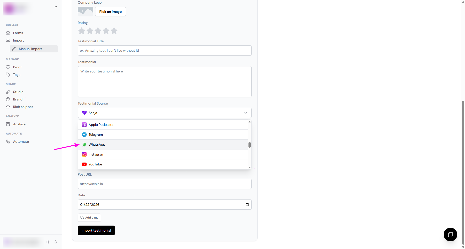 In the Testimonial Source dropdown, choose WhatsApp