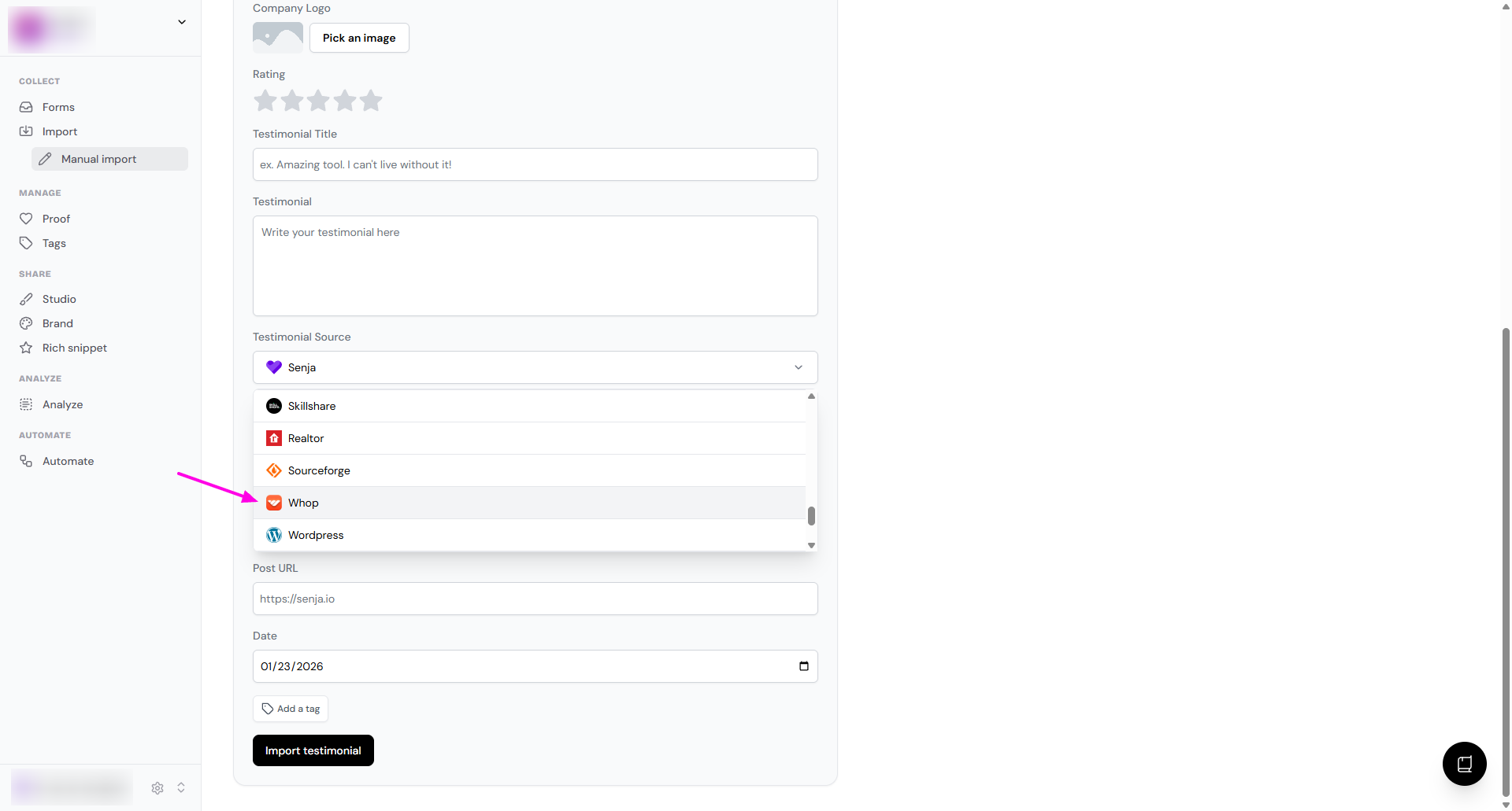 You can also follow this guide to import your testimonials automatically from Whop: How to auto-import testimonials from other platforms