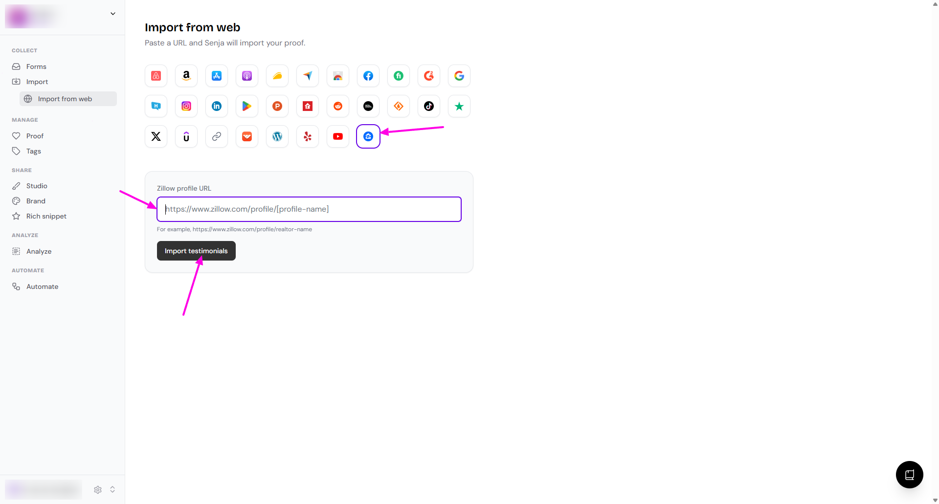 Senja lets you import reviews from your Zillow agent profile and automatically sync new ones as they come in.