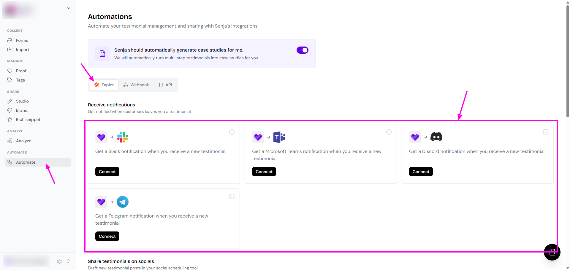 You can automate your testimonial management and sharing with Senja. Build your own recipe with Zapier, or use our pre-made templates.