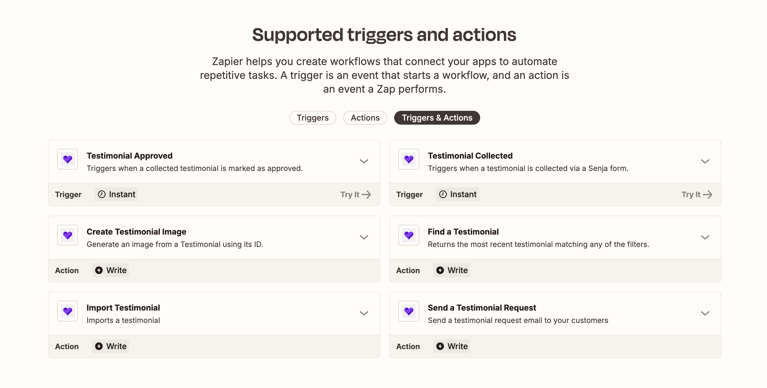 These are the trigger and action events available as part of Senja's Zapier integration: