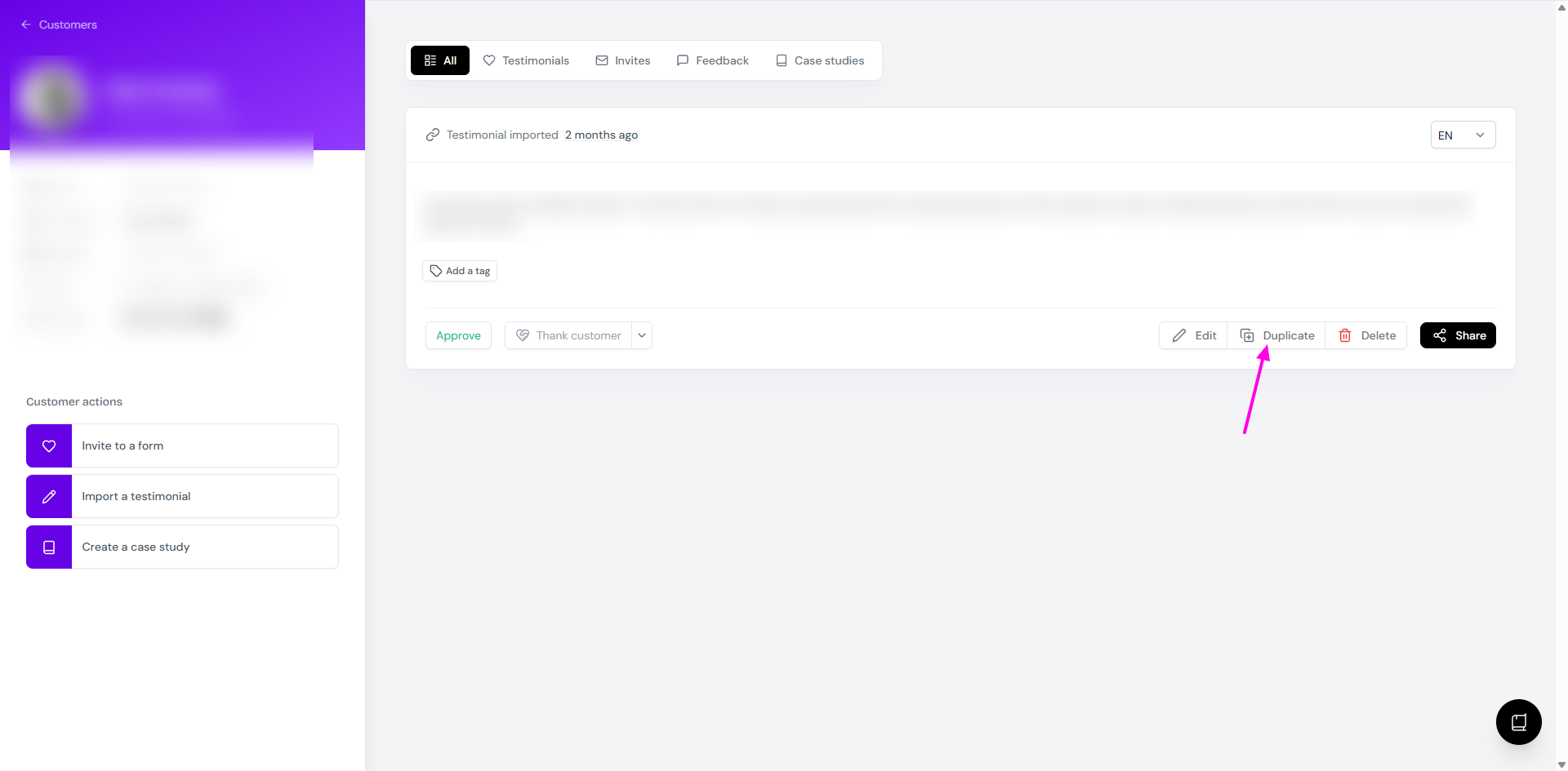 Open the customer/testimonial that you want