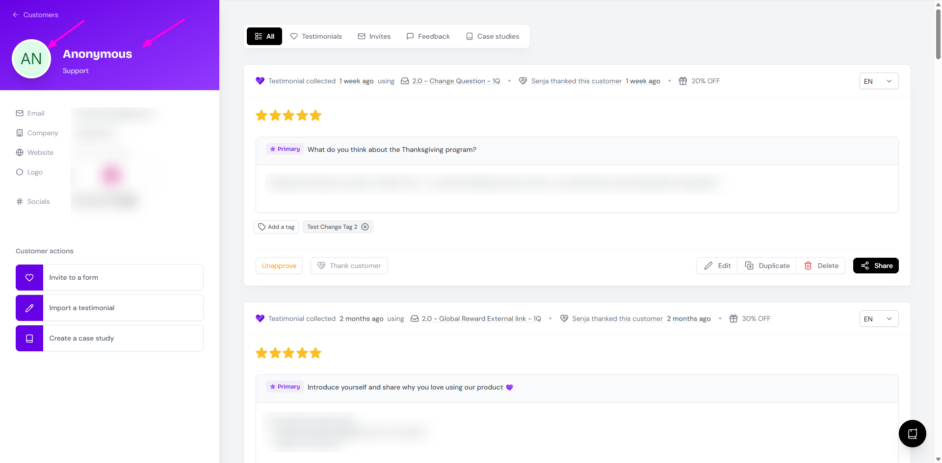 At the moment, there’s no native setting within Senja that will make testimonials anonymous. However, there’s a workaround you can use to anonymise your testimonials and we’ll show you how!