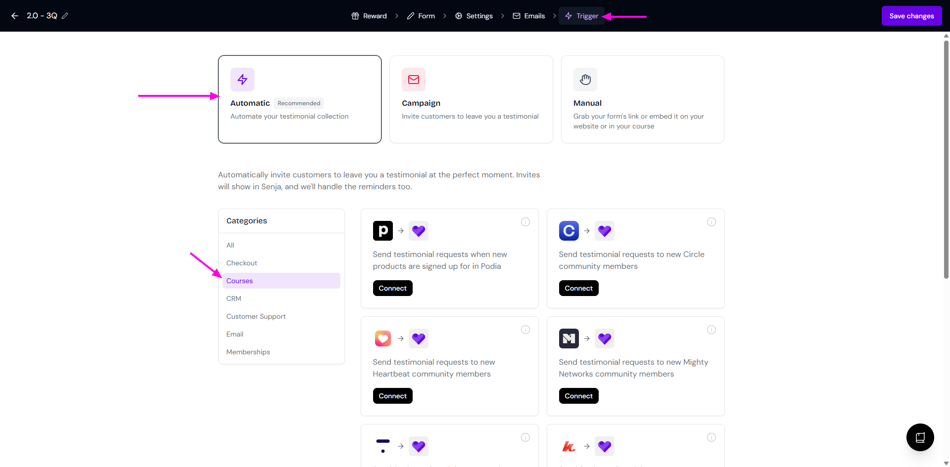 Auto-collect sends a testimonial request email to your students when something happens in your Teachable account.
