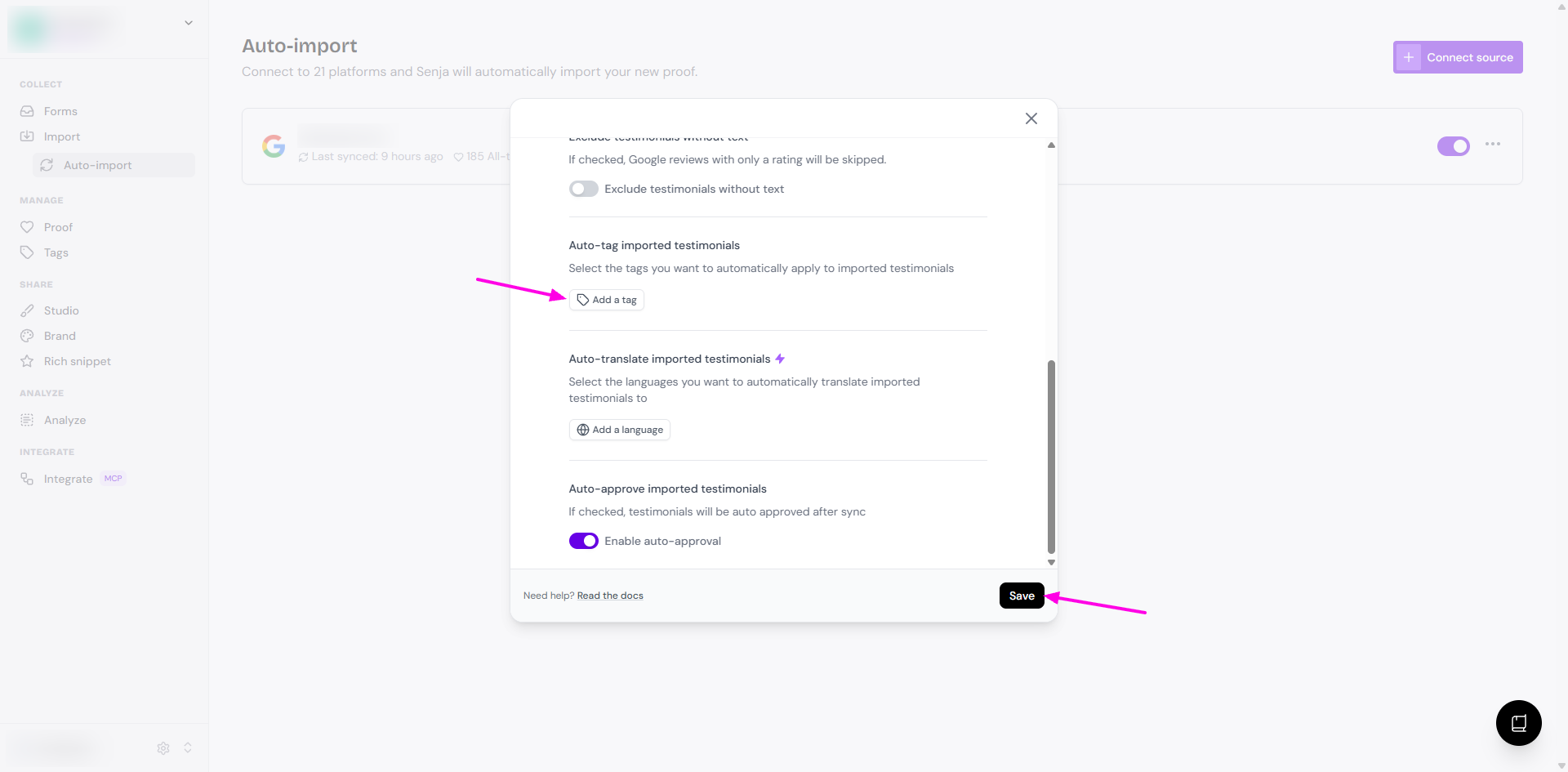 Read more about auto-import in How to auto-import testimonials from other platforms.