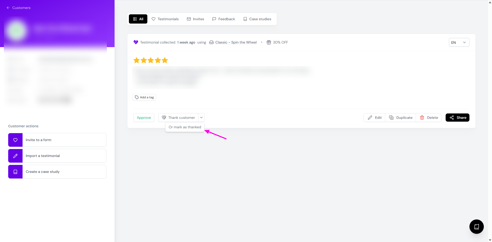 Choose the customer/testimonial you want to thank