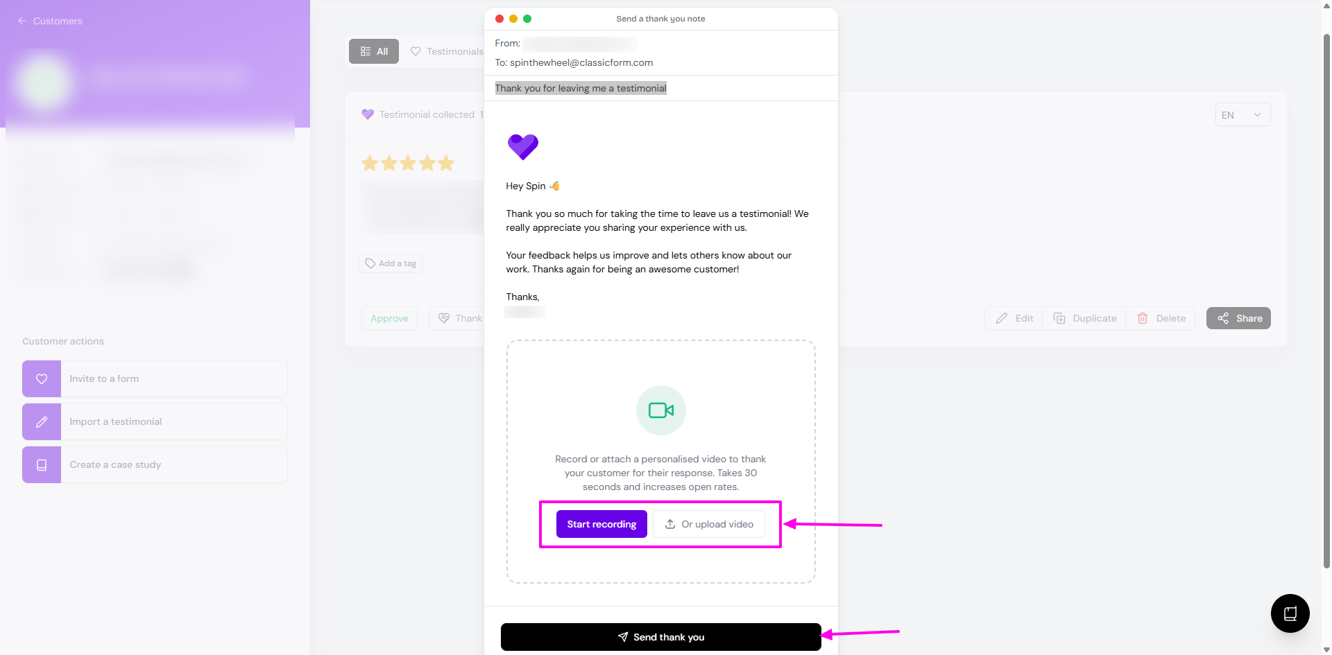Thanking customers for their testimonials goes a long way. Senja lets you send a personalised thank-you video directly from the app — or simply mark a testimonial as thanked if you've already reached out another way.