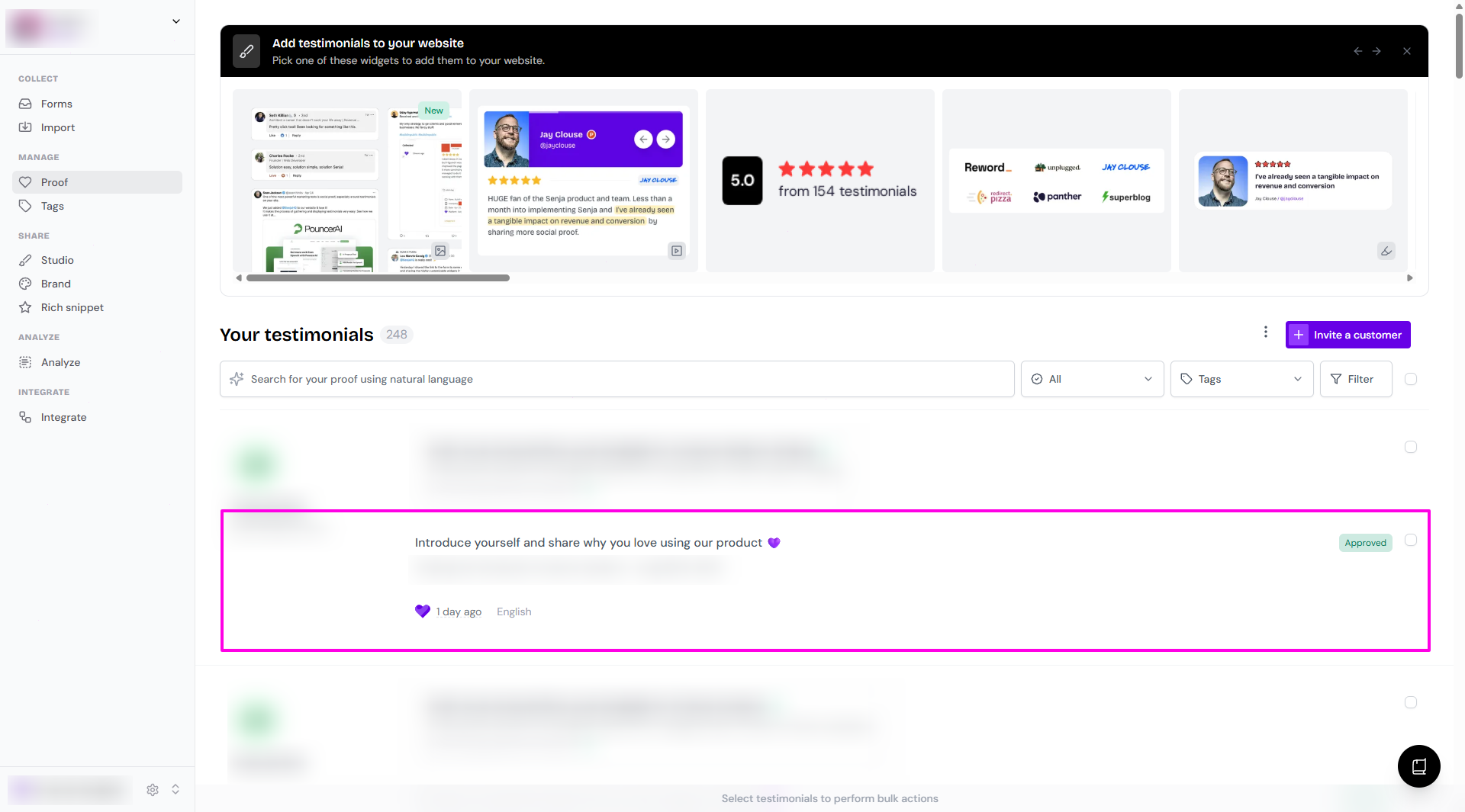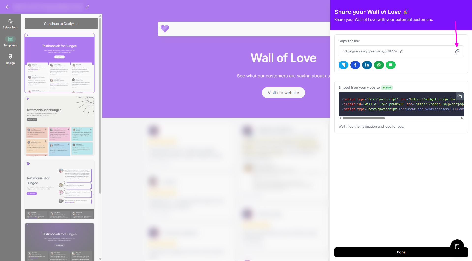 When you have a testimonial ready in your Proof page or as a Wall of Love in your Studio page, you can grab the link and share it anywhere.