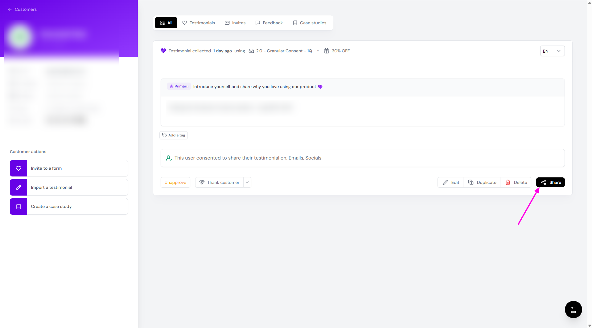 Sharing testimonial link