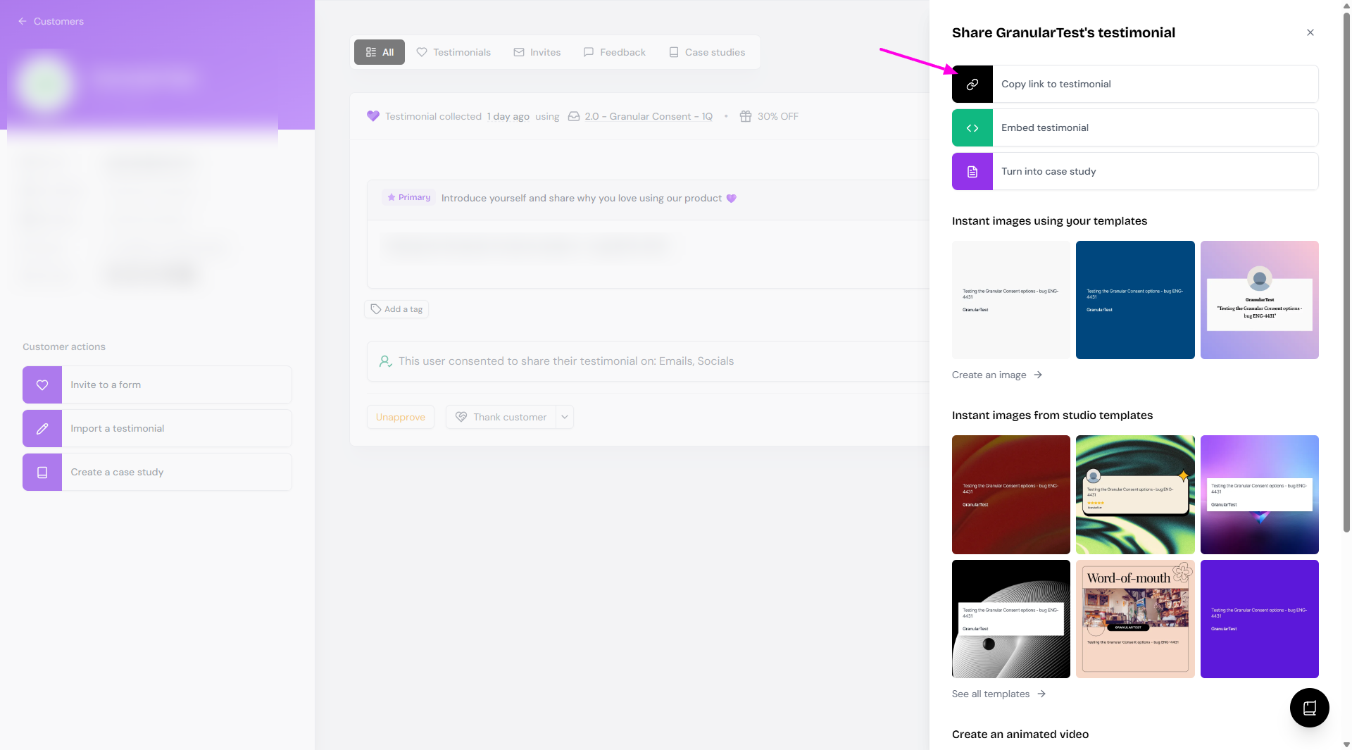 Choose Copy link to testimonial