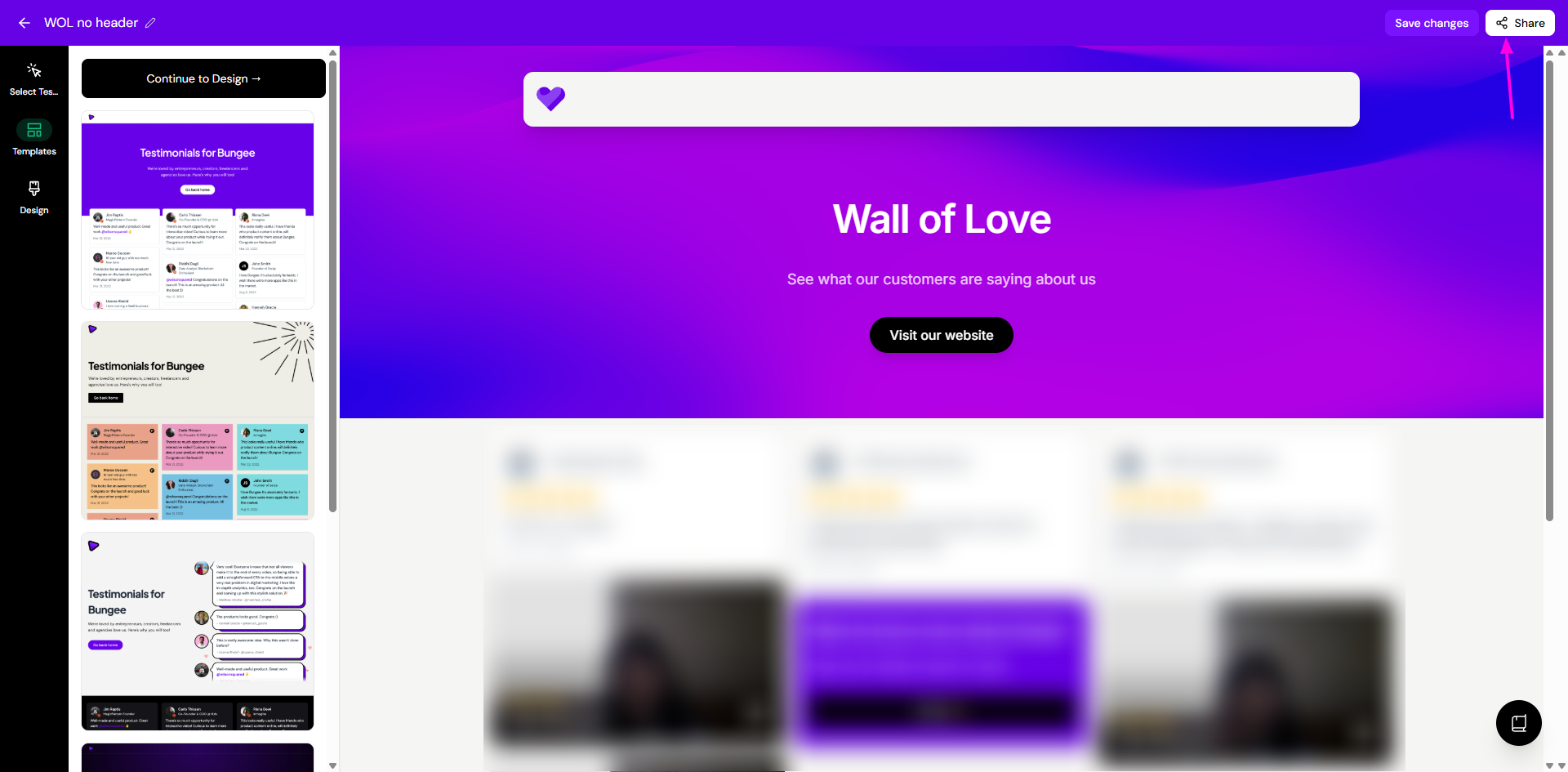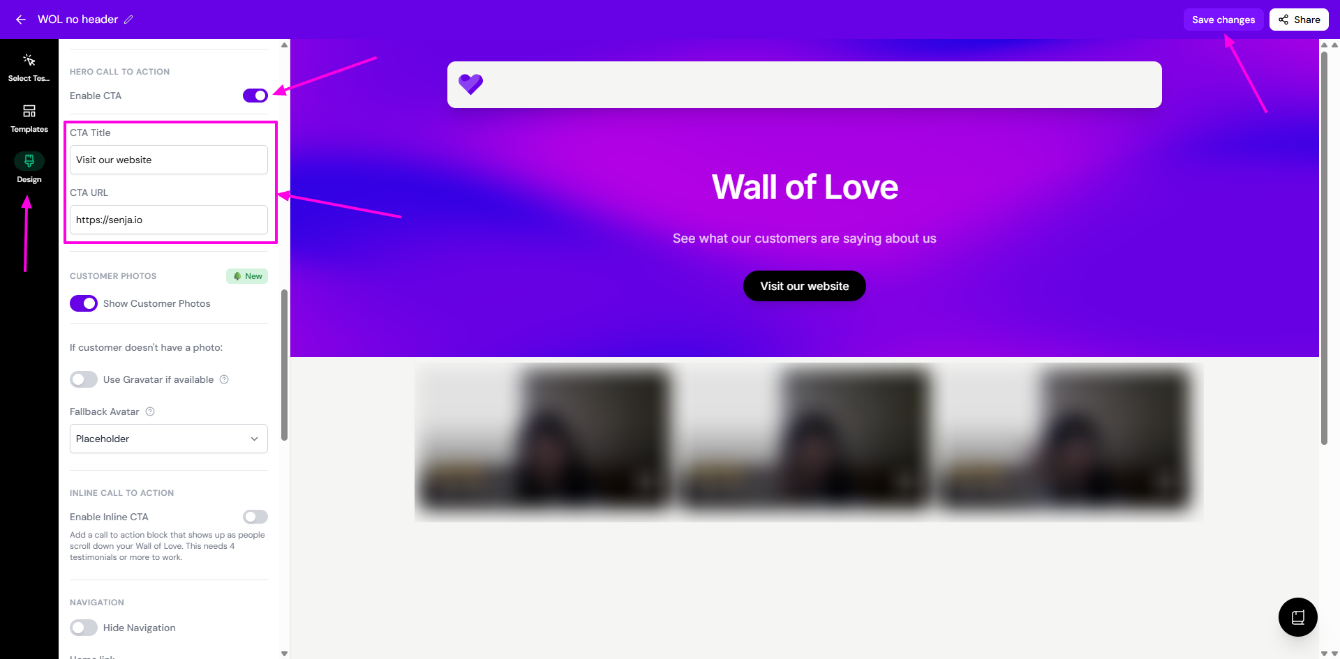 When you share your Wall of Love as link, make sure you preview the link first and set your CTA (or skipping the CTA setup).