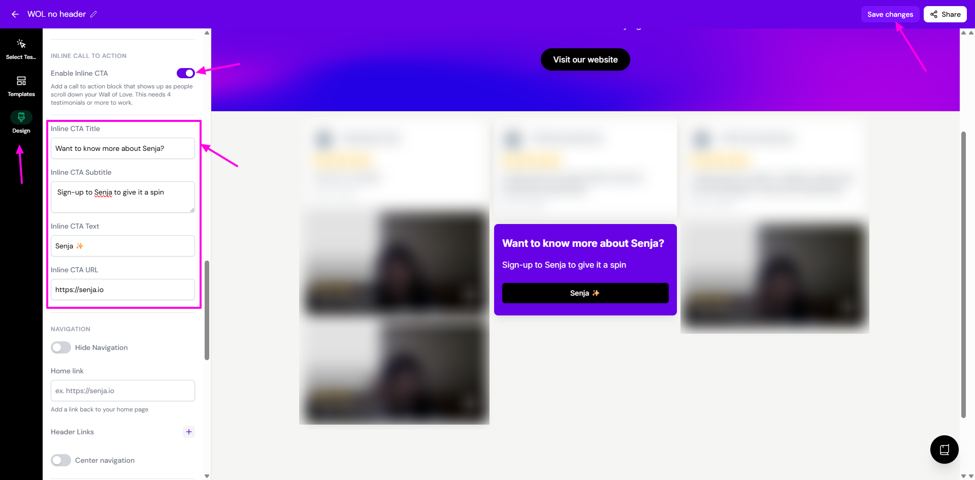 You can see how the inline CTA will look like directly in the Wall of Love preview