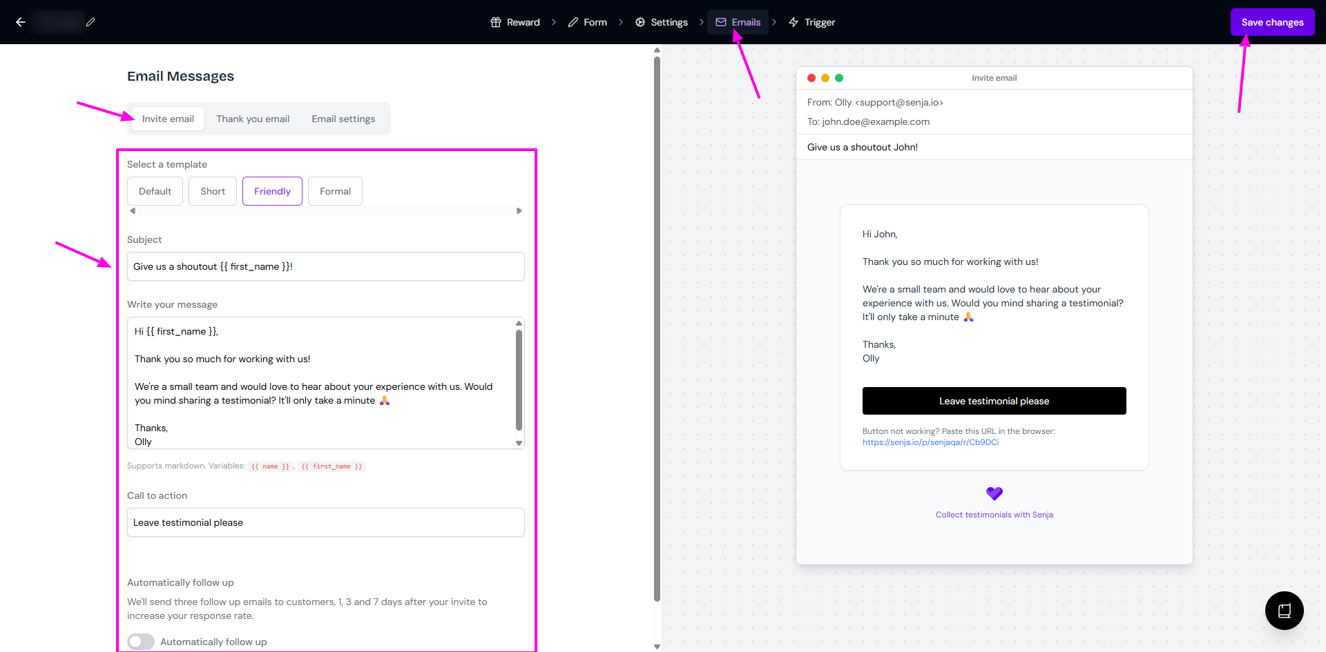 Automatically follow up: Toggle to send reminder emails at 1, 3, and 7 days