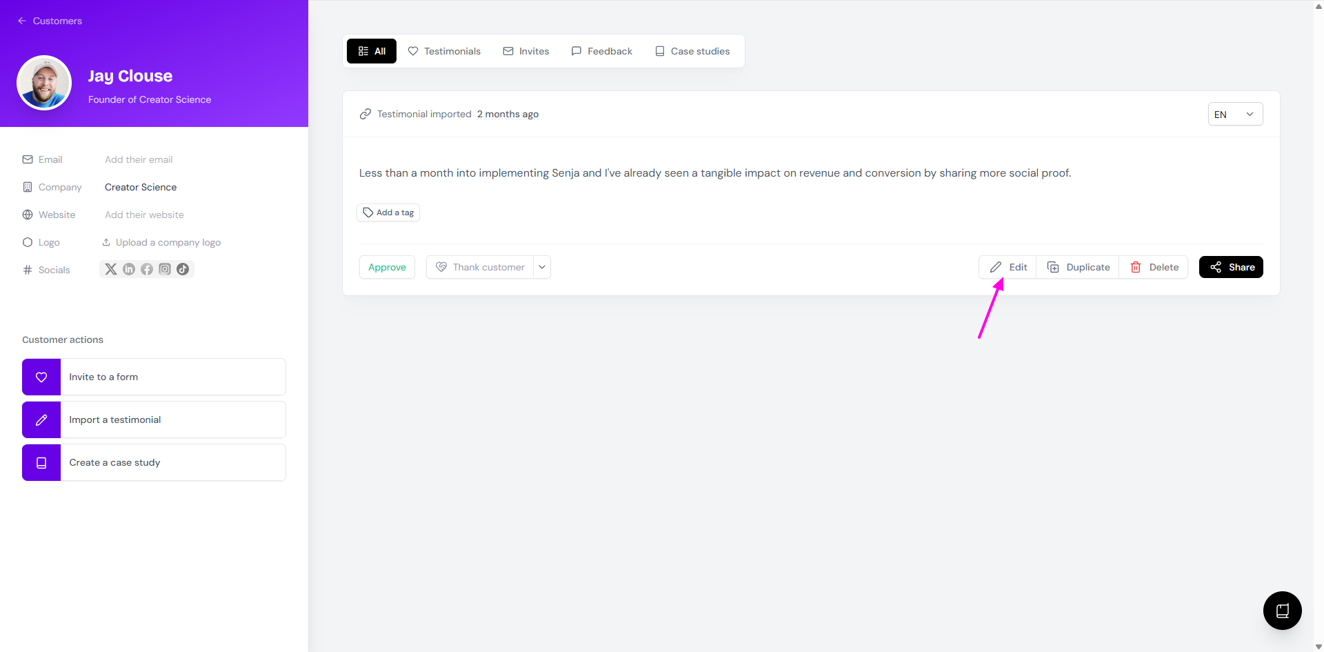 Click on the customer/testimonial that you want to edit