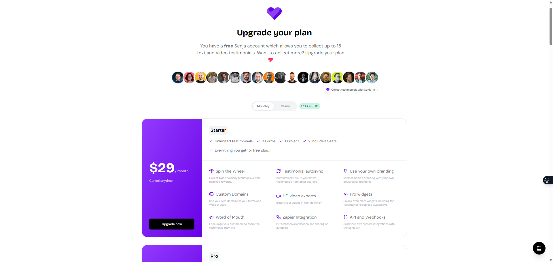 Upgrade to Starter or Pro to get unlimited testimonials. See How do I change my Senja plan?